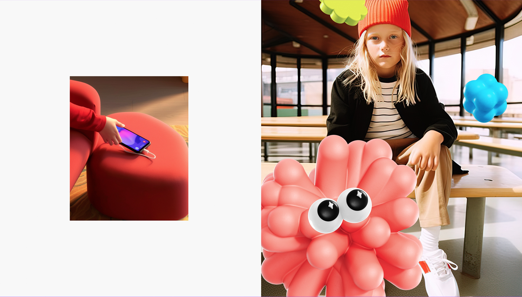 В 3D-объектах воссоздана противоречивая эстетика детского мира, где игра и познание окружающего мира стоят на первом месте, – этого удалось достичь за счет подбора разнообразных фактур и поверхностей: пластилиновые, гладкие и шершавые, глиттерные и светящиеся объекты. 3D-фигуры композиционно соединяются с фотографиями и контролсами, поддерживают их динамику и взаимодействуют с героями.