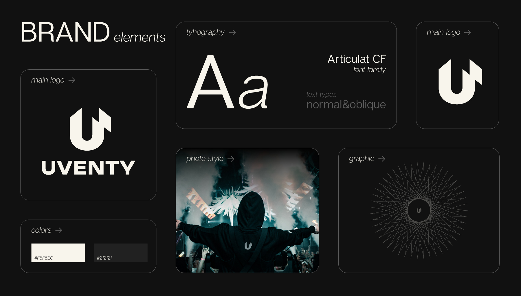 В рамках проекта по брендингу UVENTY мы разработали простой, звучный нейминг, минималистичный логотип и элементы фирменного стиля. Дизайн—система UVENTY построена на использовании трендовой типографики, чёрно—белой цветовой палитры и геометричных графических элементов. Благодаря тому, что базовые константы айдентики способны без труда сочетаться с уникальным стилем каждого проводимого брендом мероприятия, нам удалось решить поставленные задачи и разработать релевантные графические решения.