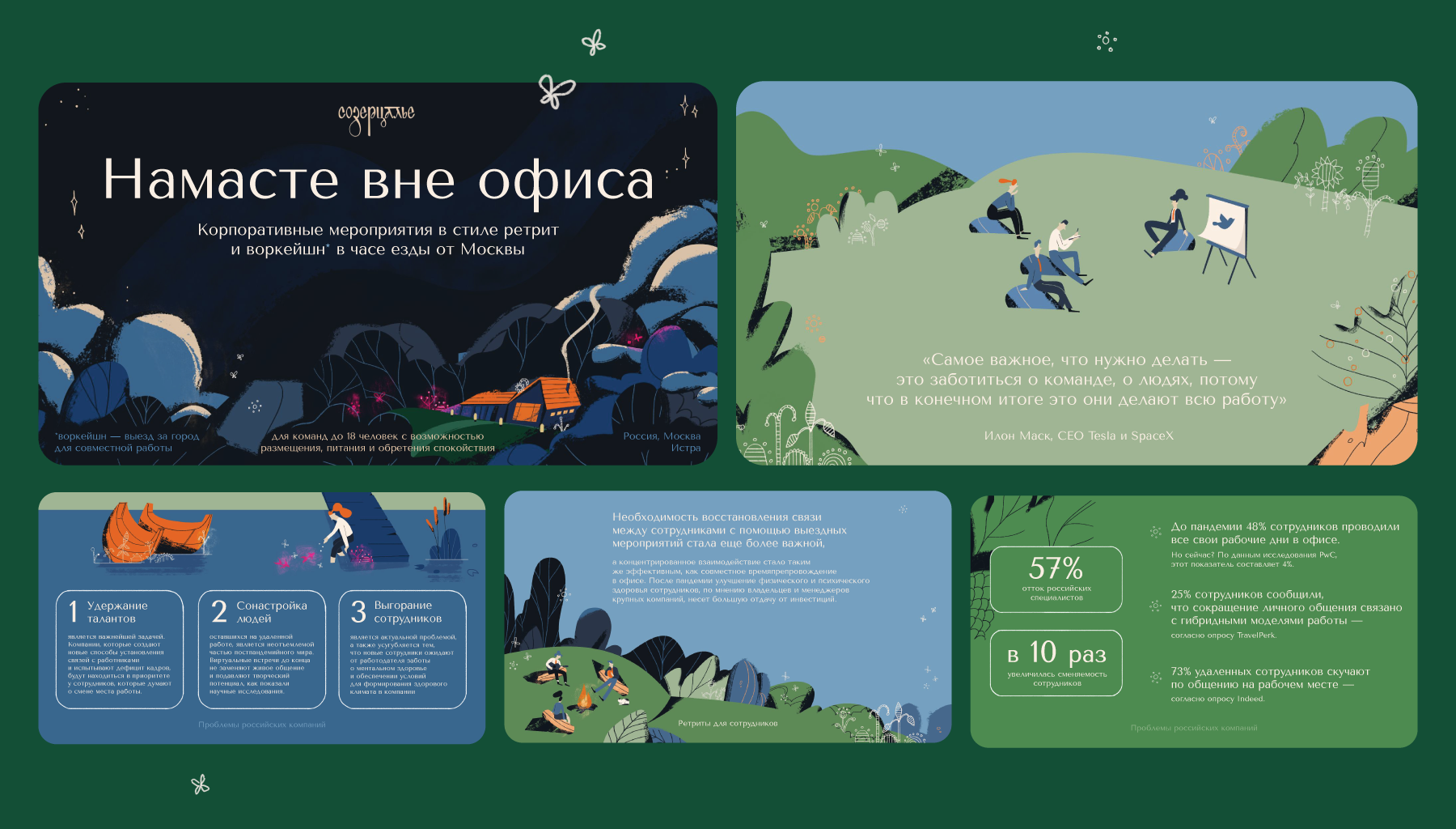 Люди в поиске возможностей для ретрита обращают большое внимание на брендинг компании — он должен вызывать доверие, ощущение спокойствия и уюта. Поэтому мы разработали айдентику, которая передаёт ценности локации и создает ощущение волшебного пространства.