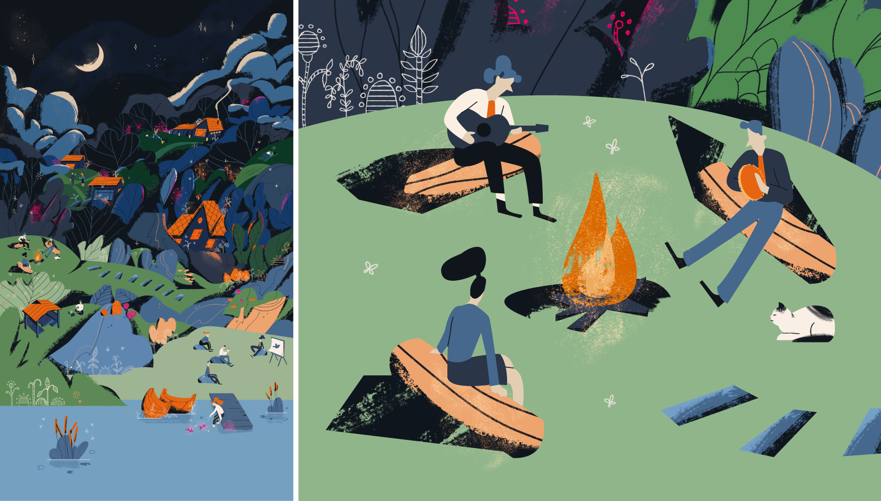 Палитра цветов вдохновлена природой, окружающей Созерцалье. Голубая река, темная теплая ночь, алые восходы и зеленая листва деревьев делают каждую нашу иллюстрацию волшебной и по-домашнему уютной.