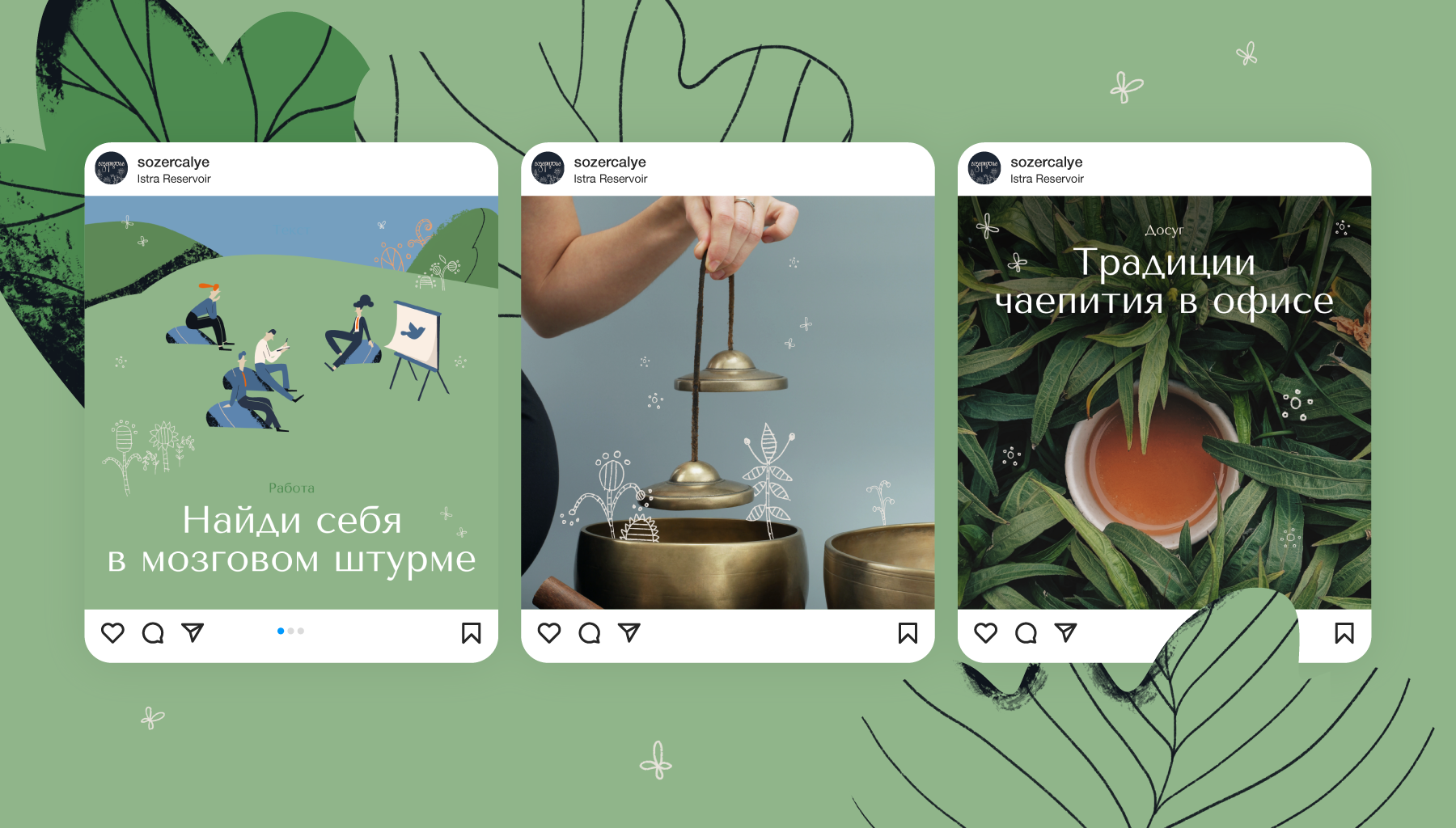 Разработанный для бренда стиль и изображения украсили мерч компании и социальные сети. Вещи от Созерцалья притягивают внимание, а посты — передают атмосферу уединения и спокойствия.