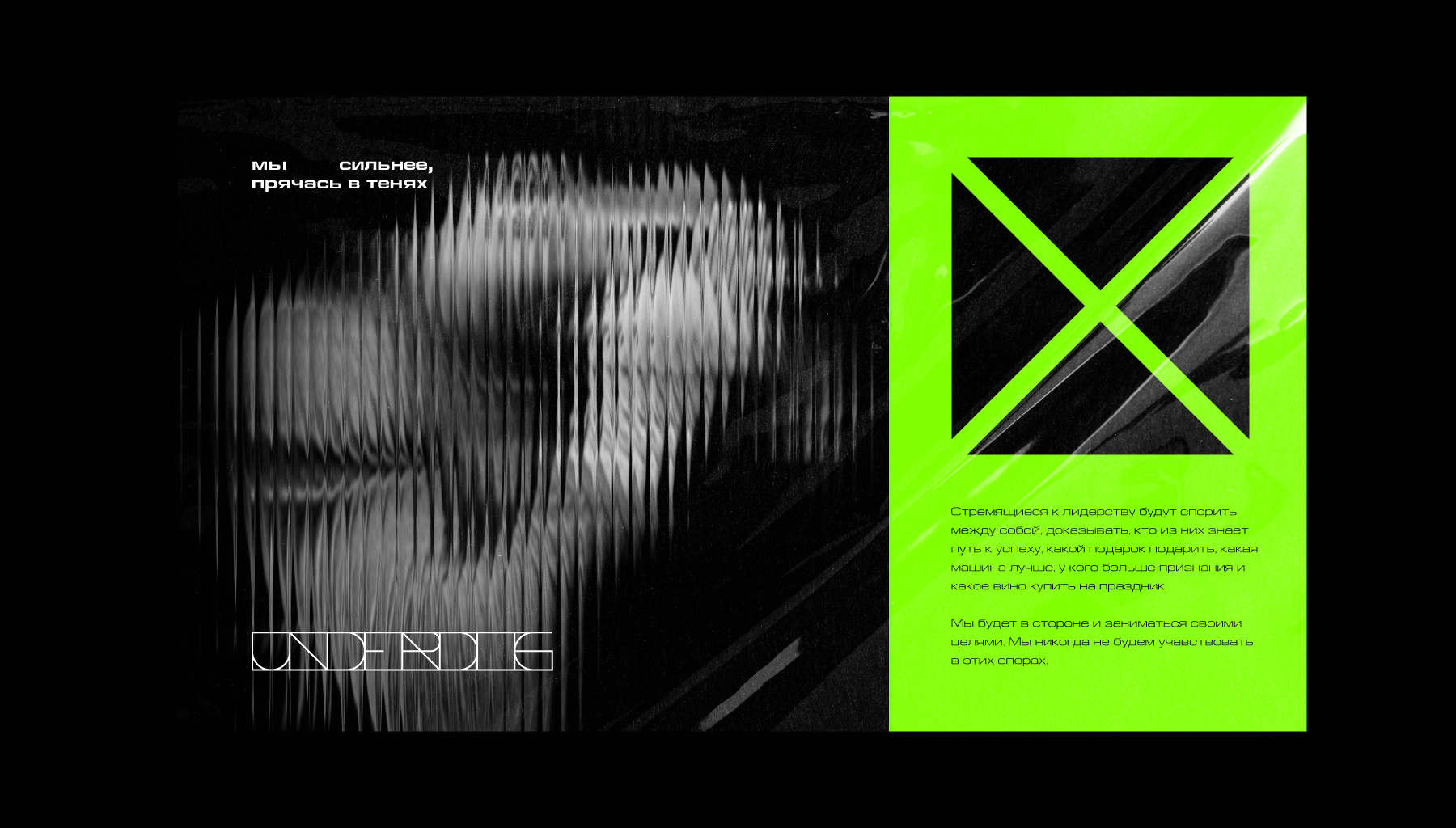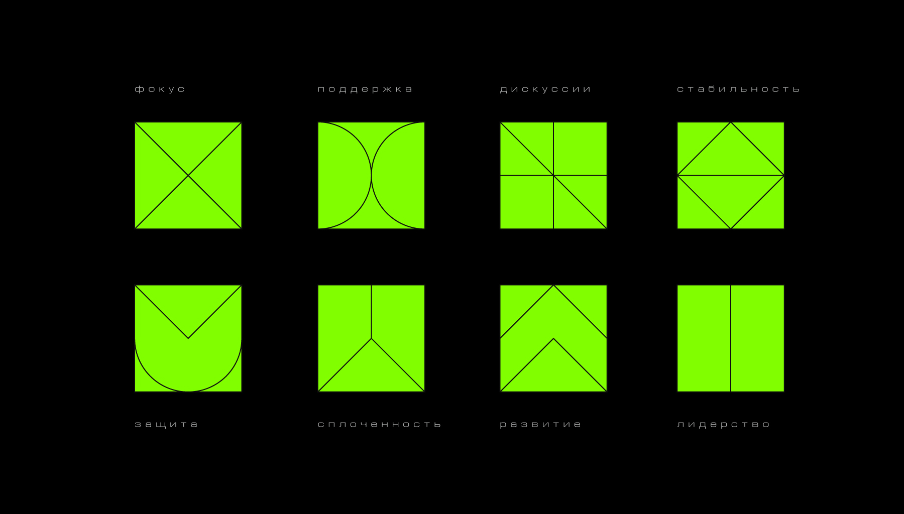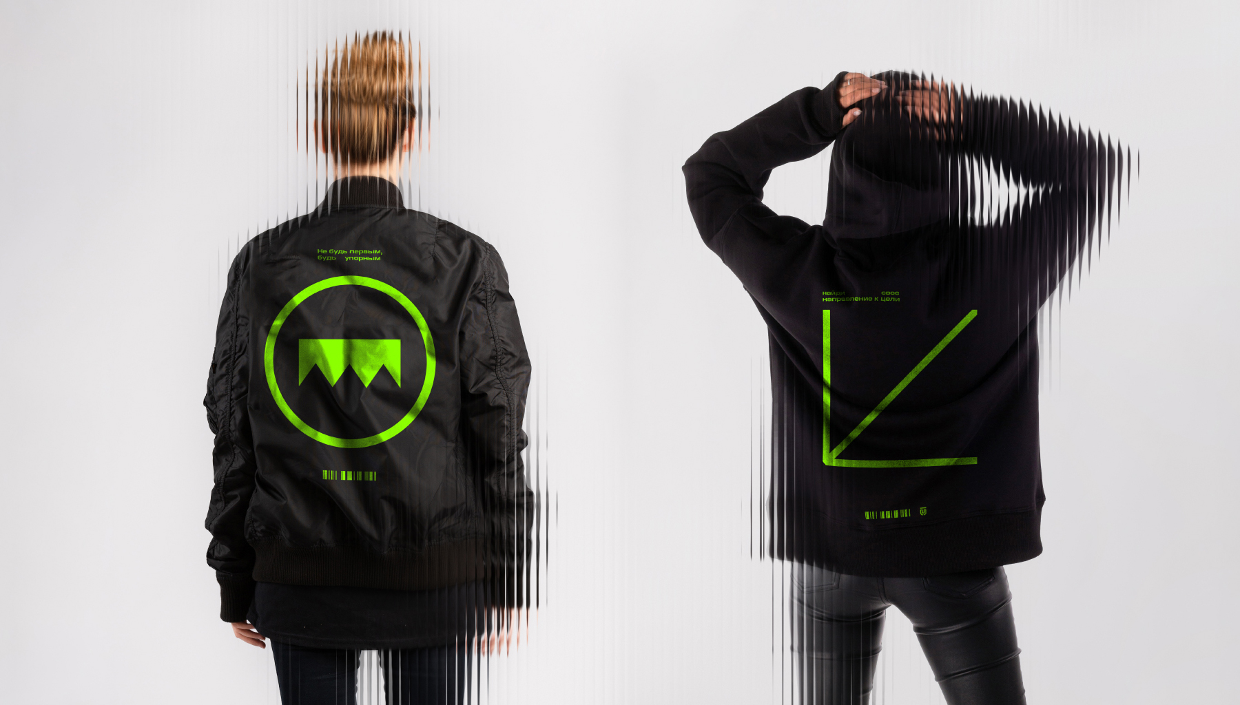 Для проекта был разработан кастомный шрифт с угловатыми и жесткими линиями. Палитра фирменных цветов состоит из черного и кислотно-зеленого, которые передают идею движения даже в сложных обстоятельствах.