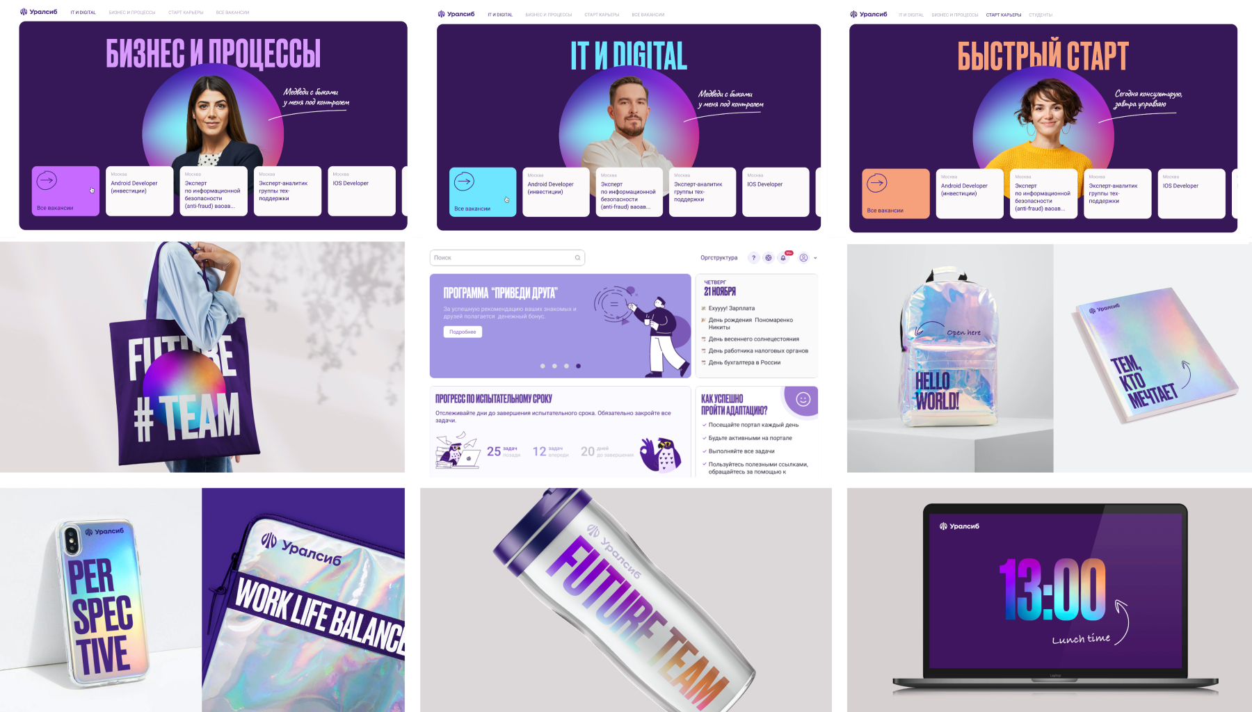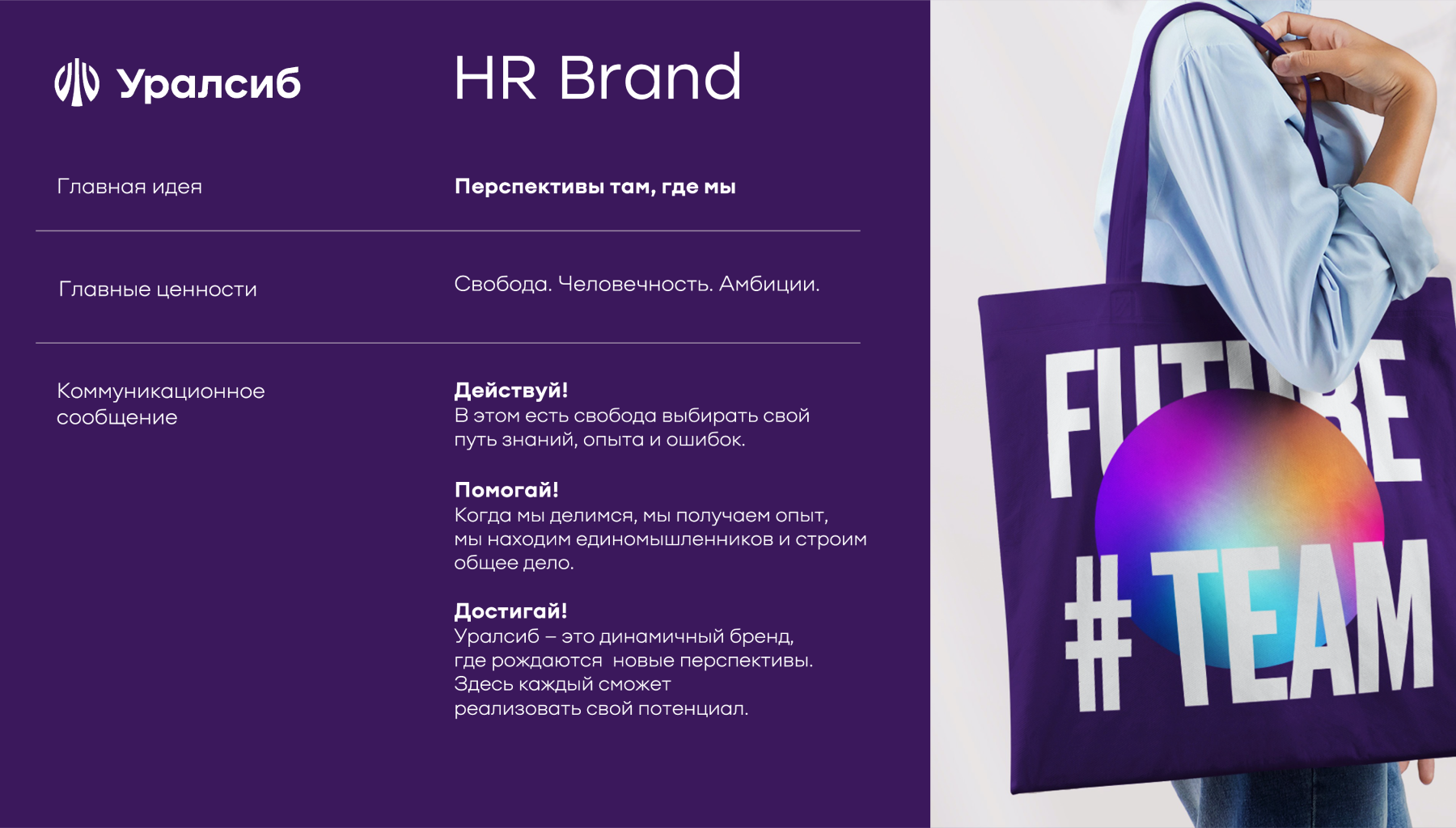 Главная идея HR бренда транслирует то же сообщение, что и Банк Уралсиб, но с упором на внутреннюю аудиторию; так, сообщение банка "Перспективы там, где вы" для HR бренда звучит как "Перспективы там, где МЫ".