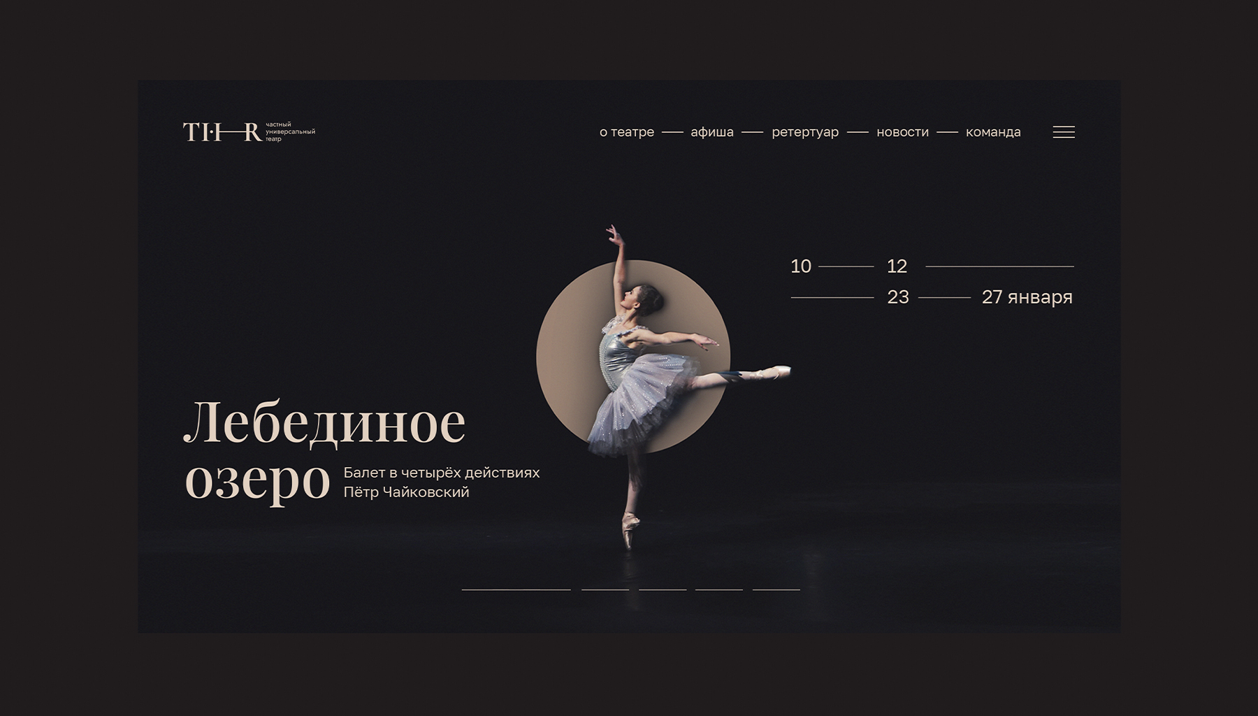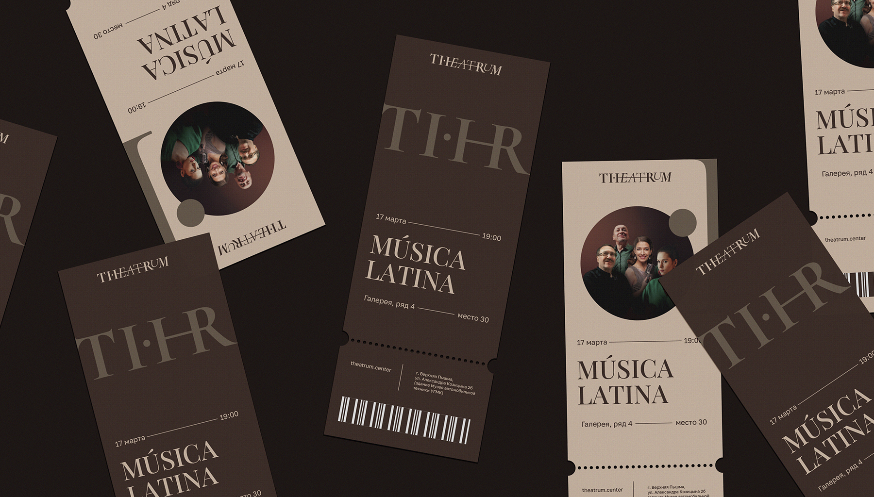 Соединительный штрих букв H и R для аббревиатуры «THR» от полного логотипа «THEATRUM» буквально дублирует позиционирование. Линии на текстовых блоках подчеркнули позиционирование и встроились в траекторию чтения, открывая зрителю искомую информацию.