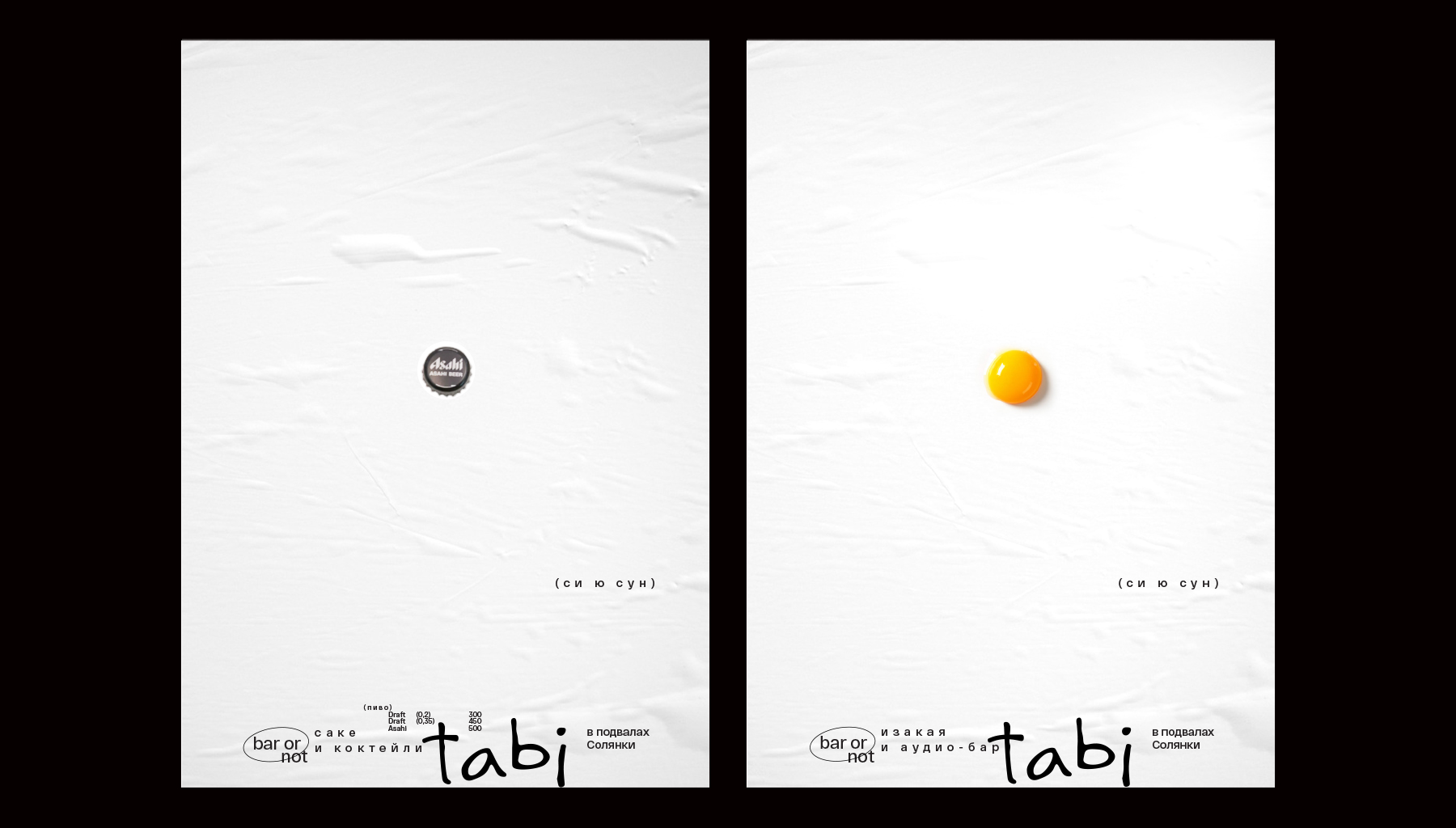 Этот необычайно кропотливый, тщательный и глубокий процесс в формировании концепции кухни и заведения мы постарались подчеркнуть и в айдентике. Икринка к икринке. Небольшие изображения, мелкая типорафика, маленькие блоки текста, расположеные на большом пространстве, как бы вторят продуманным маленьким порциям, естественным образом подстегивающим любопытство. Известно, что таби — традиционная рабочая обувь и крой носков рикш в Японии, характерные отпечатки следов которых мы использовали в подставках под стопки саке.