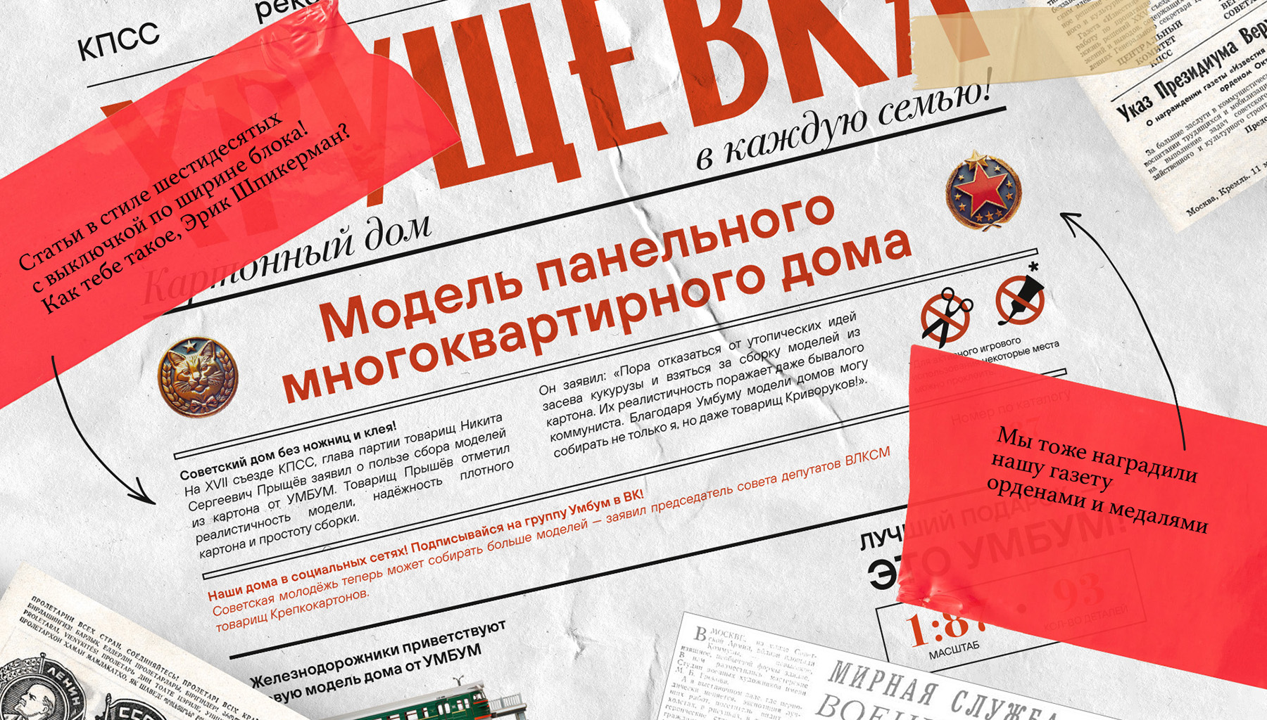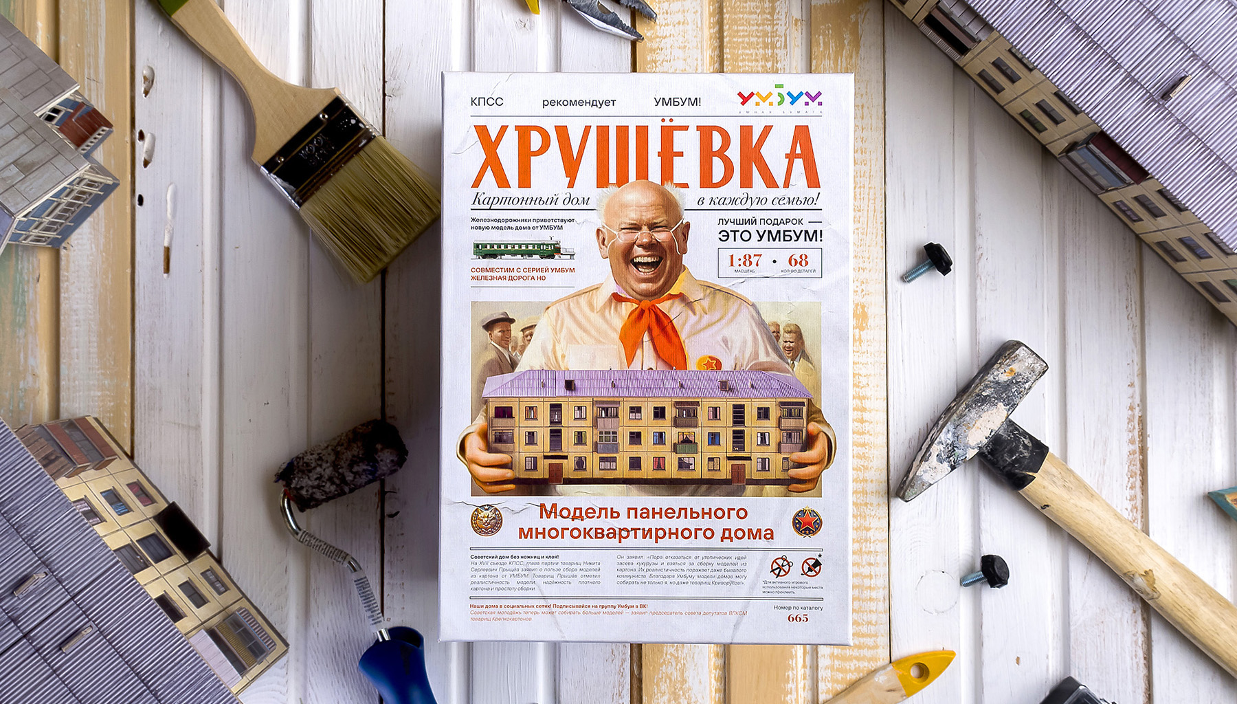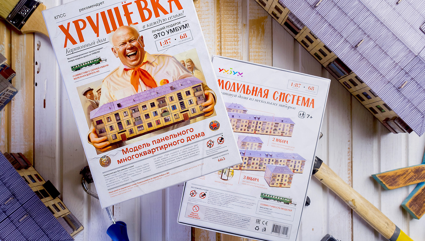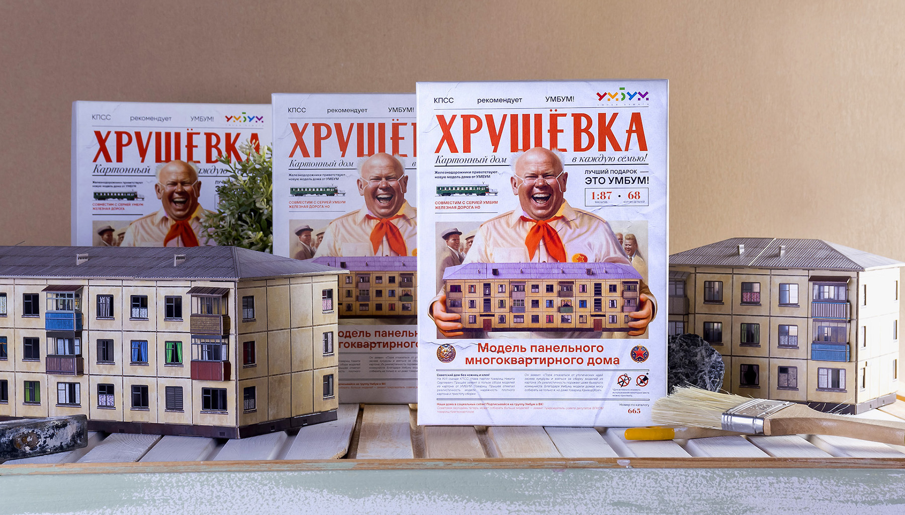 УМБУМ создает невероятные модели из картона и делает их виртуозно. Но, как и любых сумасшедших профессоров, конструкторов из УМБУМ иногда посещает непреодолимое желание сделать что-нибудь странное. Так вышло и на этот раз. Ребята пришли к нам с картонной моделью обычного панельного дома в масштабе 1:87. ТЗ звучало так: «Нам очень захотелось построить из картона «хрущёвку», но как теперь её продавать – мы не понимаем».