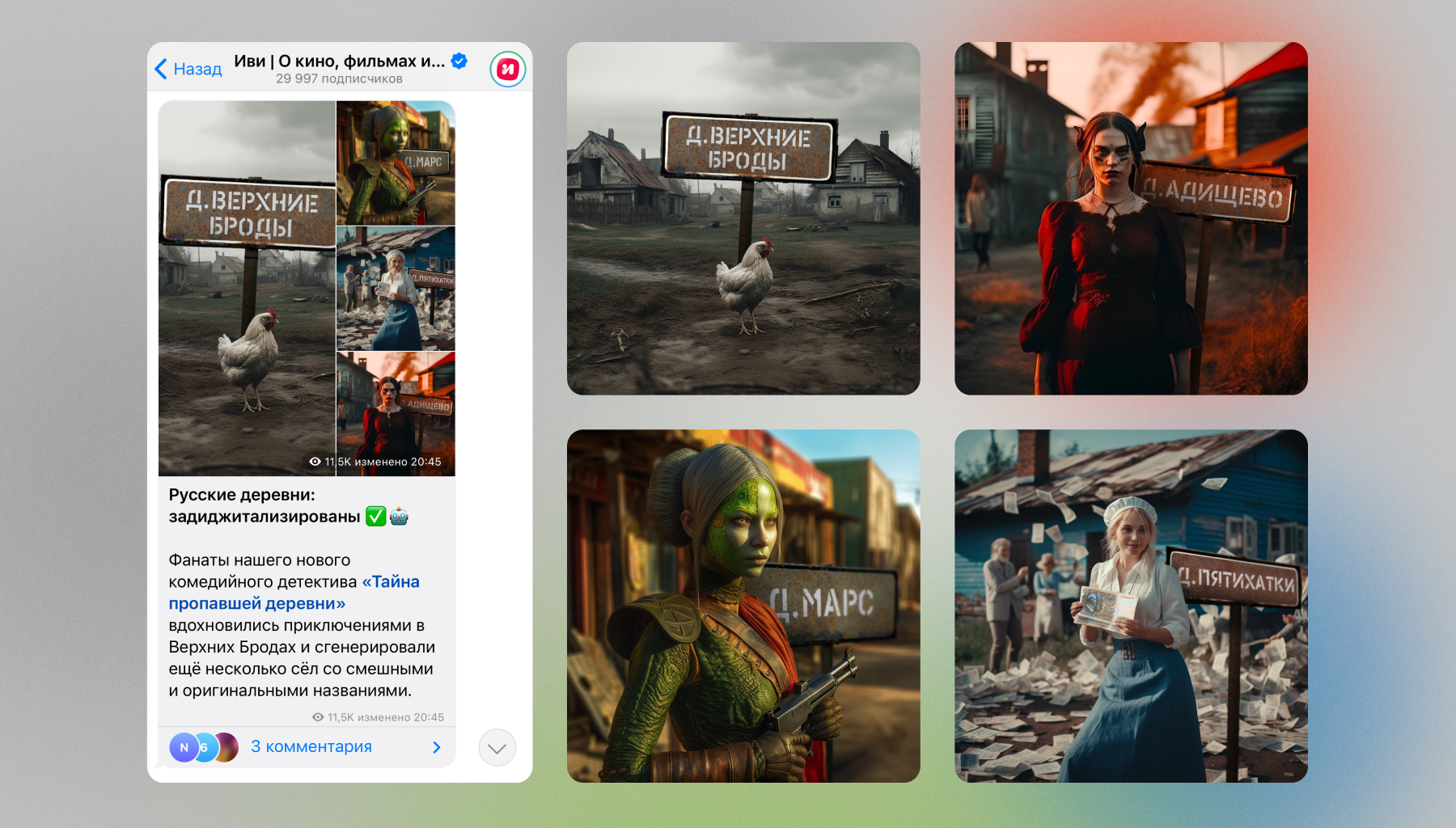 Так же для продвижения сериала мы использовали нейросети для создания образов вымышленных российских деревень в соответствии с их названиями. Это тоже стало  и дало пользователям посмотреть на русскую культуру с другой стороны.