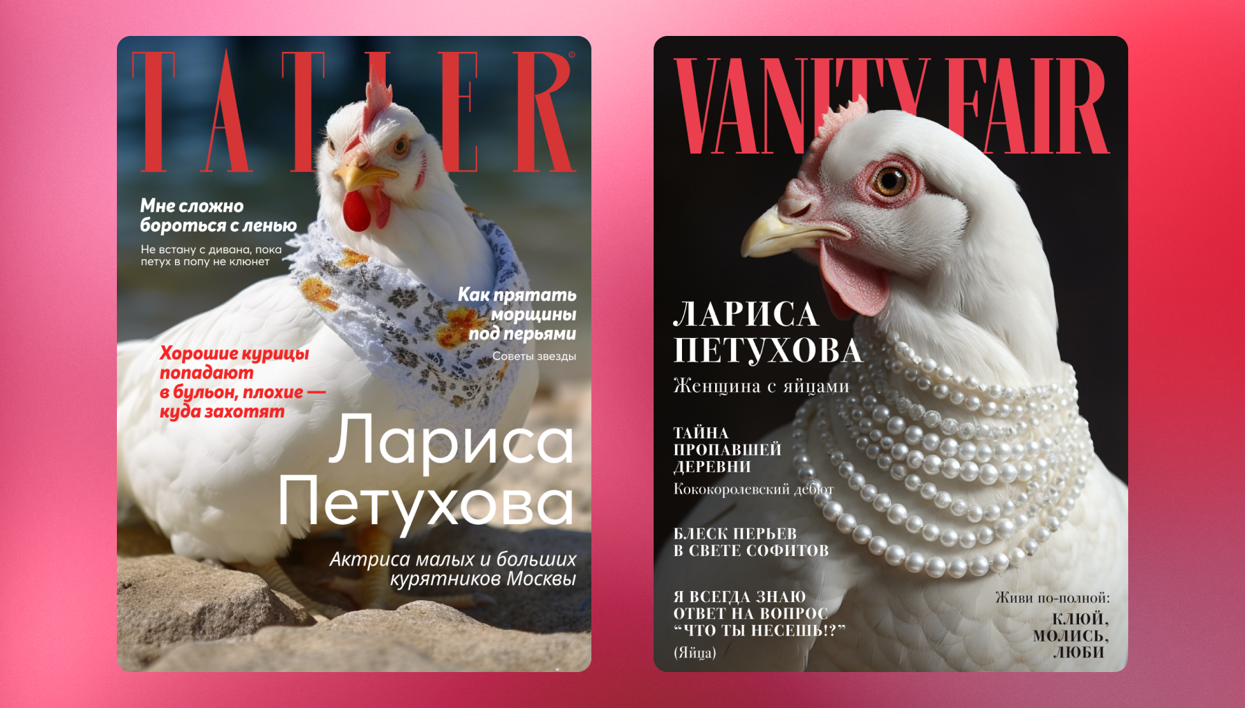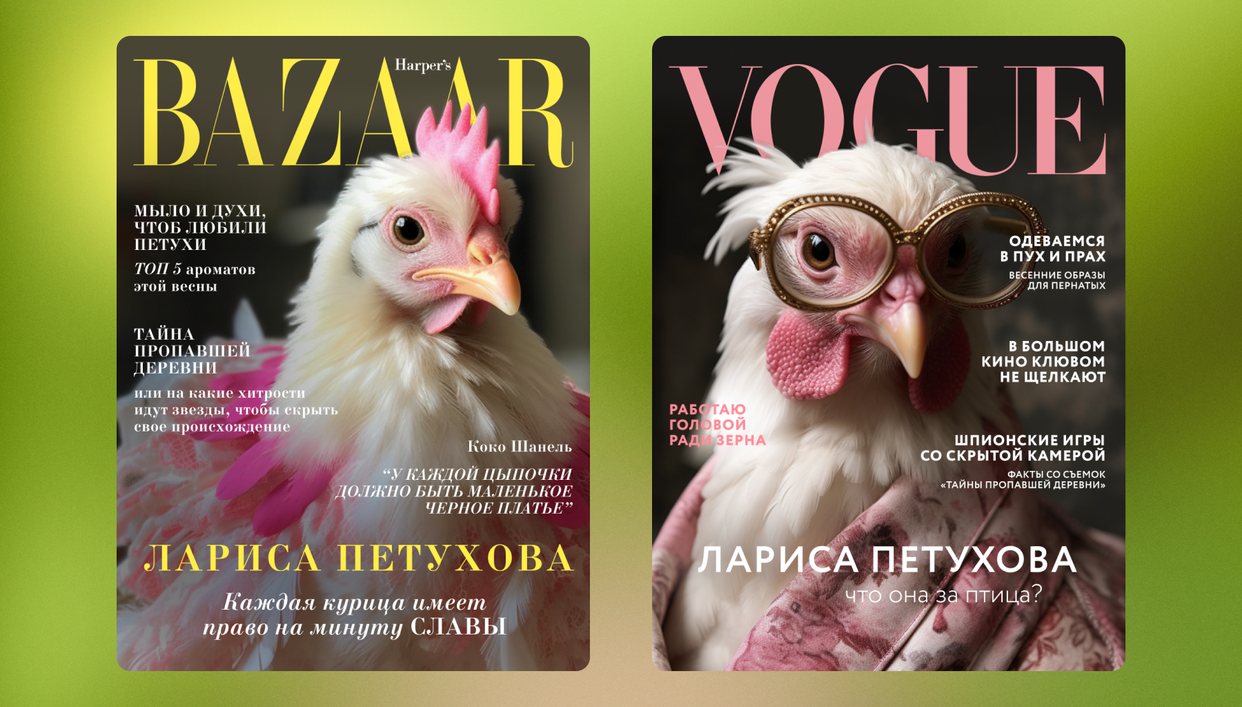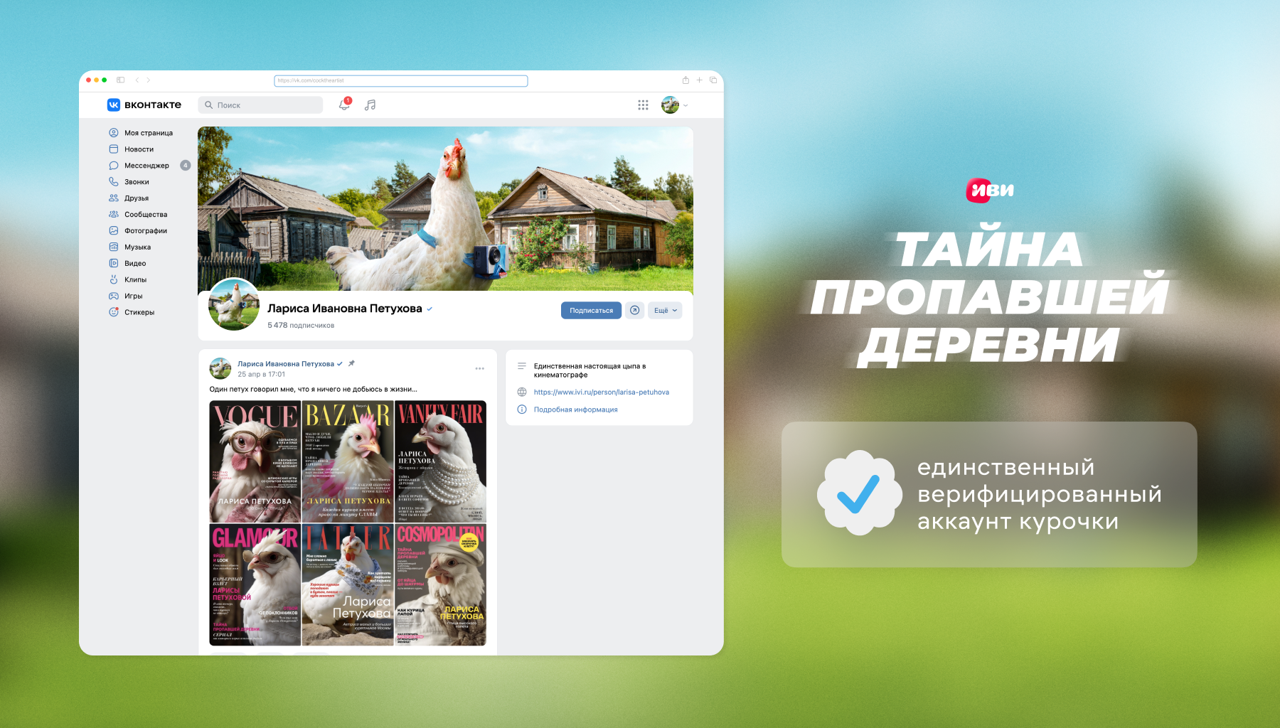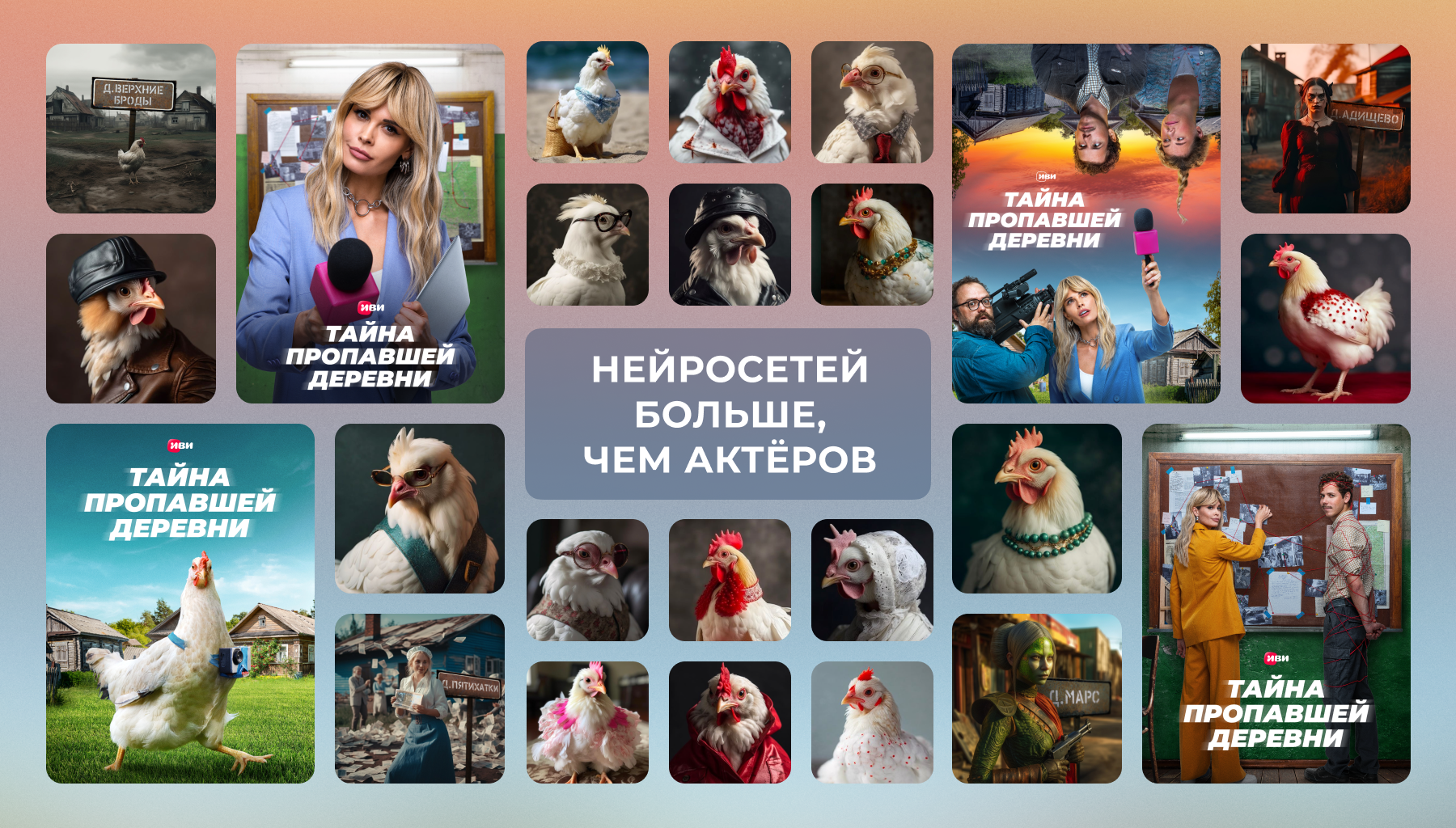 Весной на Иви состоялась премьера сериала «Тайна пропавшей деревни», частью продвижения сериала стали возможности нейросетей для создания героев и локаций. Главной героиней тизер-трейлера стала курица, она же исполнила в сериале эпизодическую роль. Иви сделал её лицом сериала. Помимо верифицрованного профиля ВКонтакте, Лариса Петухова (так мы её назвали) стала звездой обложек глянцевых журналов: Vanity Fair, Tatler, Vogue и других, созданных нами с помощью нейросетей.