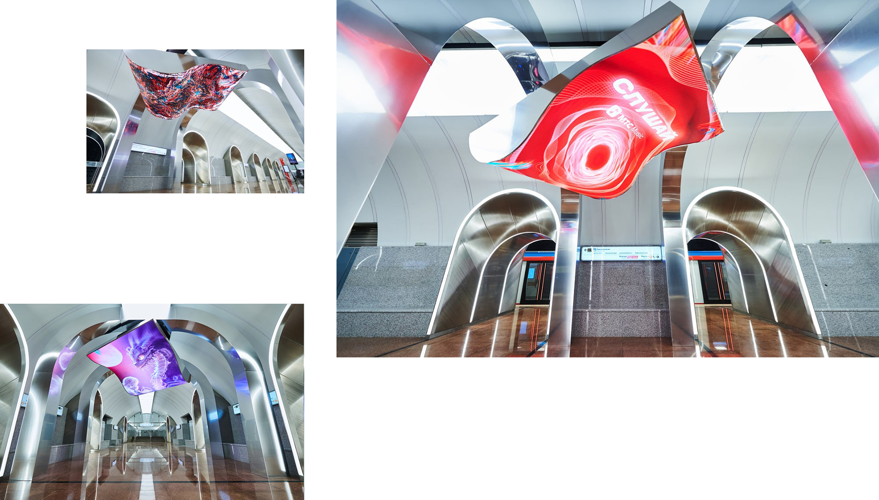 Инсталляция органично вписалась в интерьер станции Рижская. Для подвеса экрана мы использовали конструктивные фермы арочного типа, закрытые зеркалами для лучшей интеграции в современный дизайн станции. Для того, чтобы передать ощущение летящей ткани в инсталляции был использован масштабный (4х2,5м) гибкий LED-экран, на котором транслировался CG-контент.