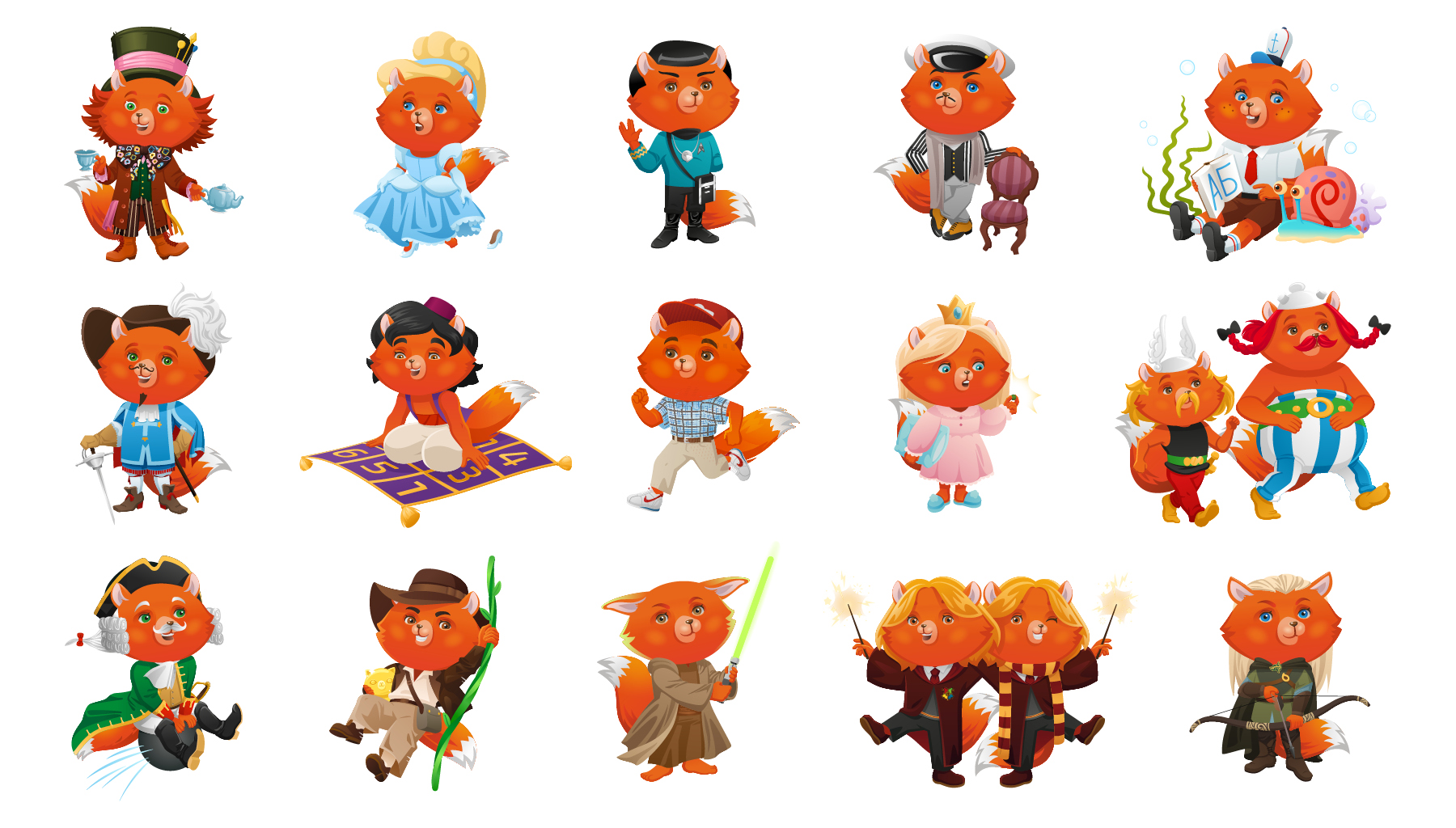 Разработать серию иллюстраций с персонажами-лисятами для использования на обложках учебных пособий, рабочих тетрадей, в настольной игре и других учебных материалах. Все персонажи — это знакомые многим герои сказок, книг, мультфильмов, фильмов или просто известные на весь мир личности. Серия все ещё продолжает пополняться и лисят становится всё больше.