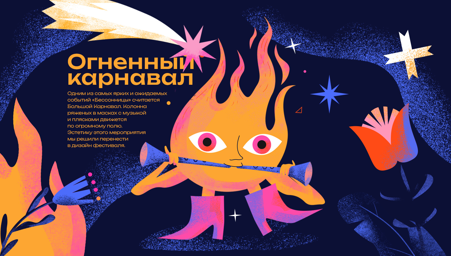 В 2023-м году наша команда решила посвятить айдентику фестиваля этому грандиозному событию, сформировав концепцию «Огненного Карнавала». Целью работы стало отражение карнавальной составляющей во всех направлениях айдентики.