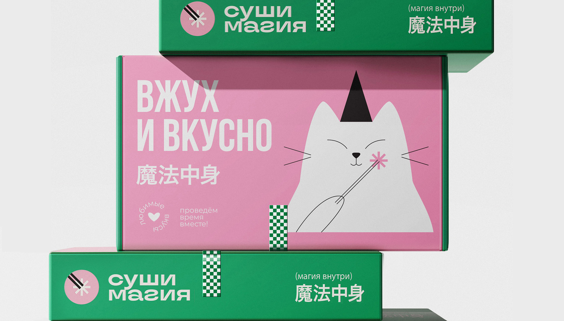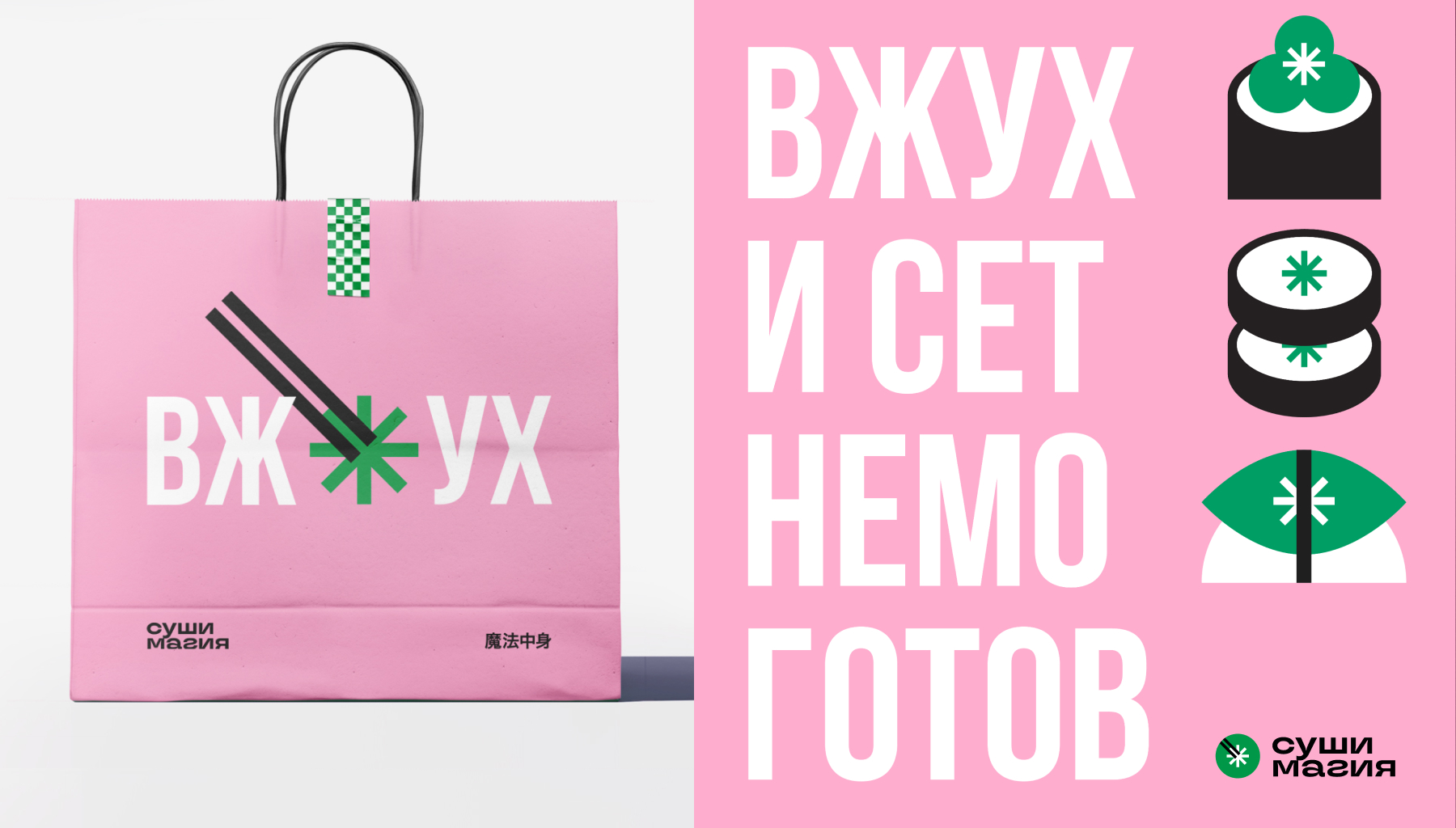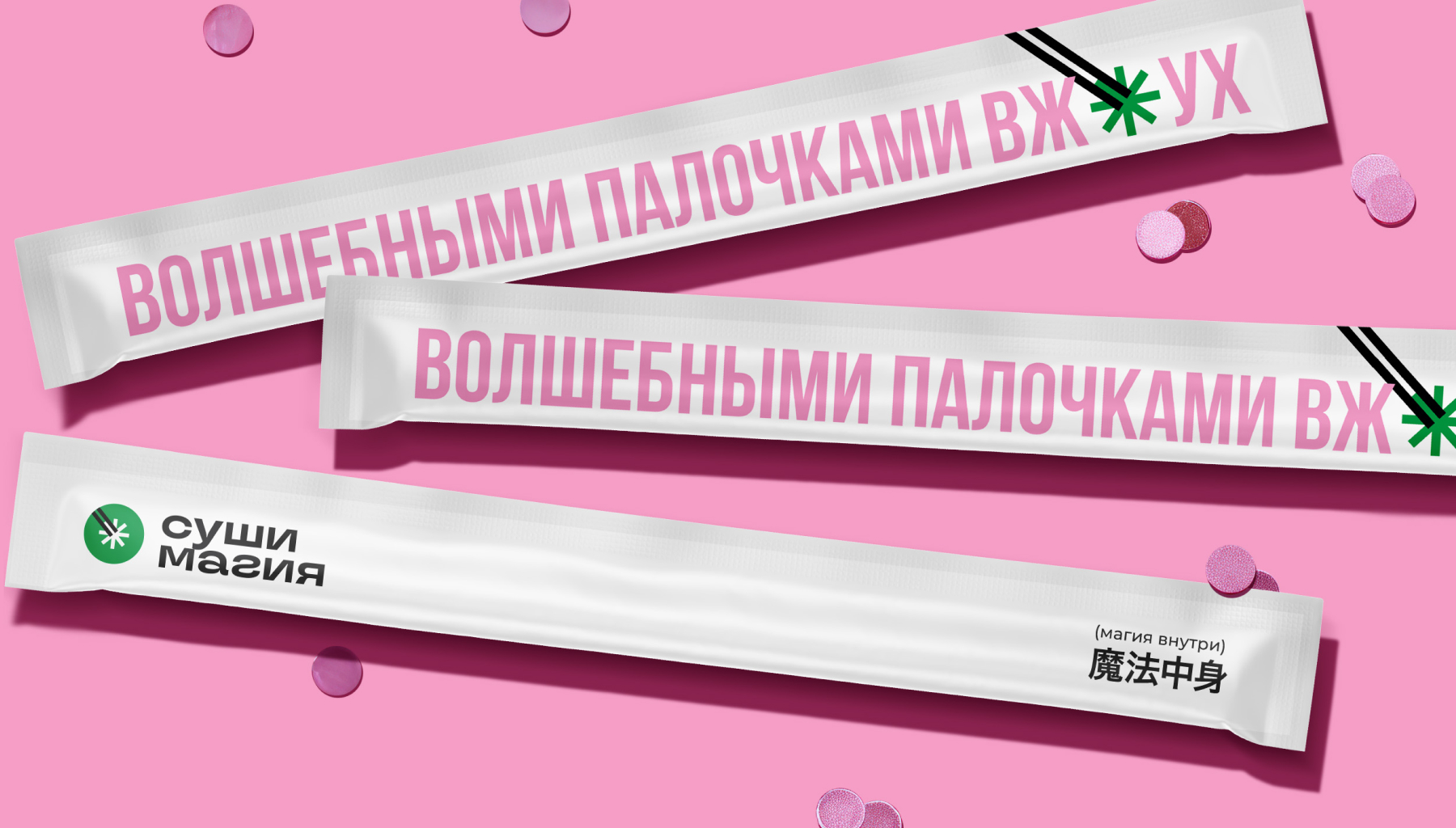 Вжух, и заказ готов, вжух и ты наслаждаешься волшебными роллами. Это магия. Суши Магия. Бренд, который делает магически вкусно. Именно эту идею мы отразили в концепции.
