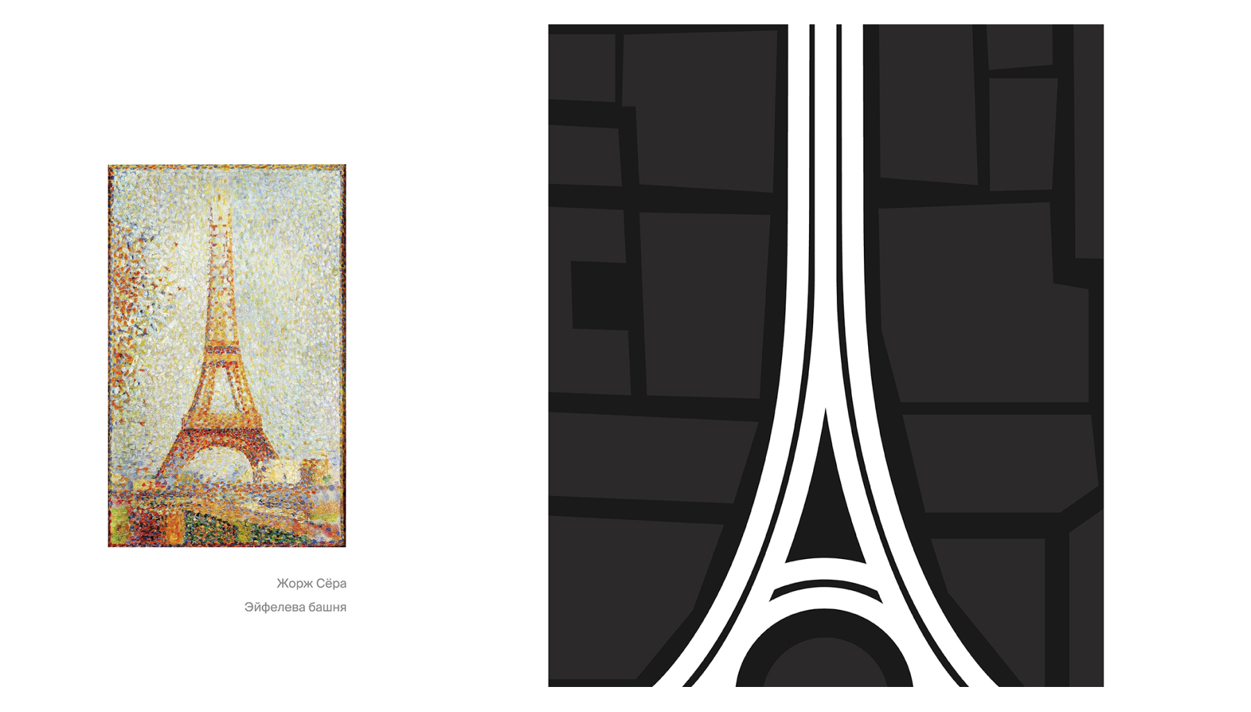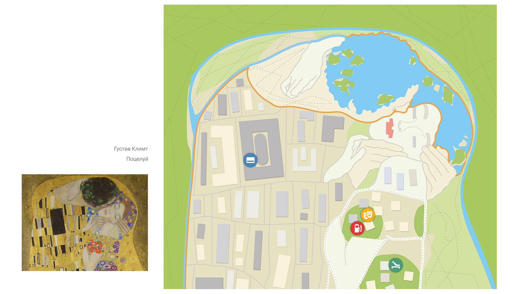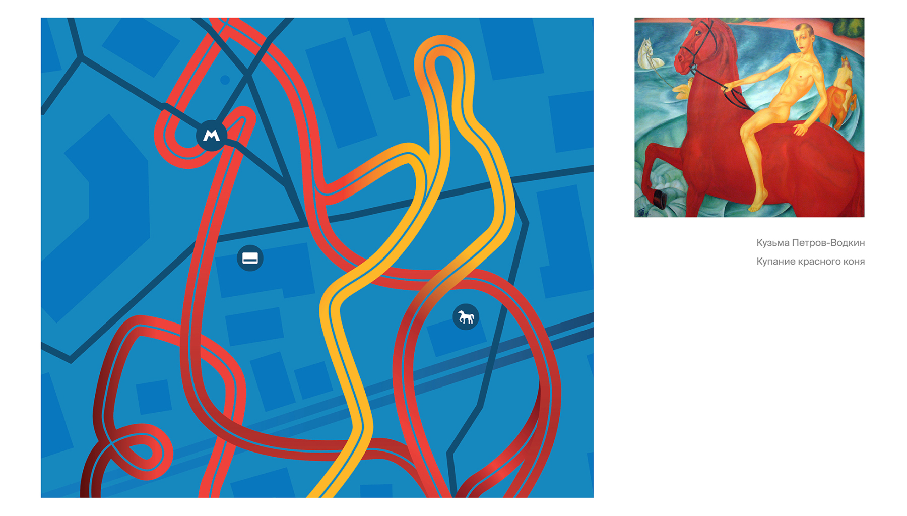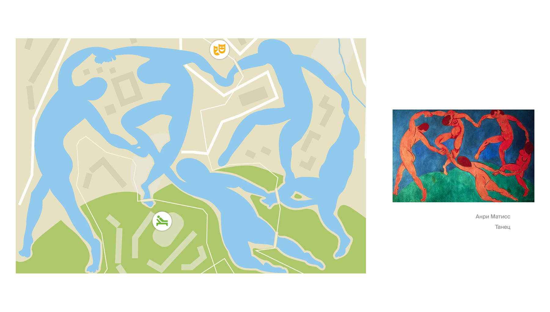 За основу для графики я выбрала узнаваемые картины художников 20 века и отрисовала так, что получилась карта местности или города, но без потери ощущения картины или объекта. В каждую иллюстрацию я внедрила символику навигатора 2ГИС, элементы интерфейса.