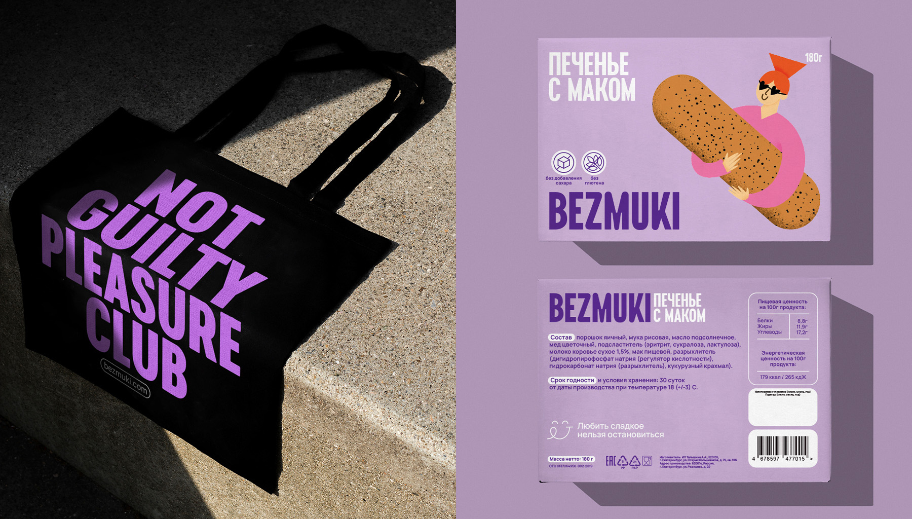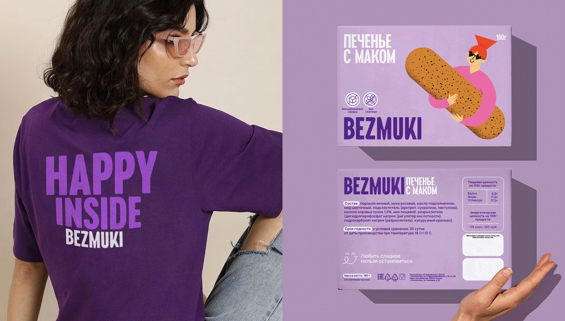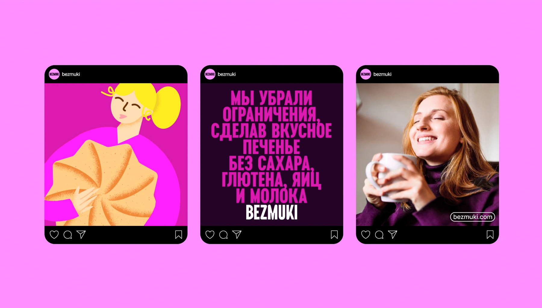 От этого инсайта и строится платформа бренда печенья BEZMUKI. Ключевой ценностью является полнота жизни, и подкрепляется она жизнерадостным, тёплым, эмпатичным характером вербальной и визуальной коммуникации.