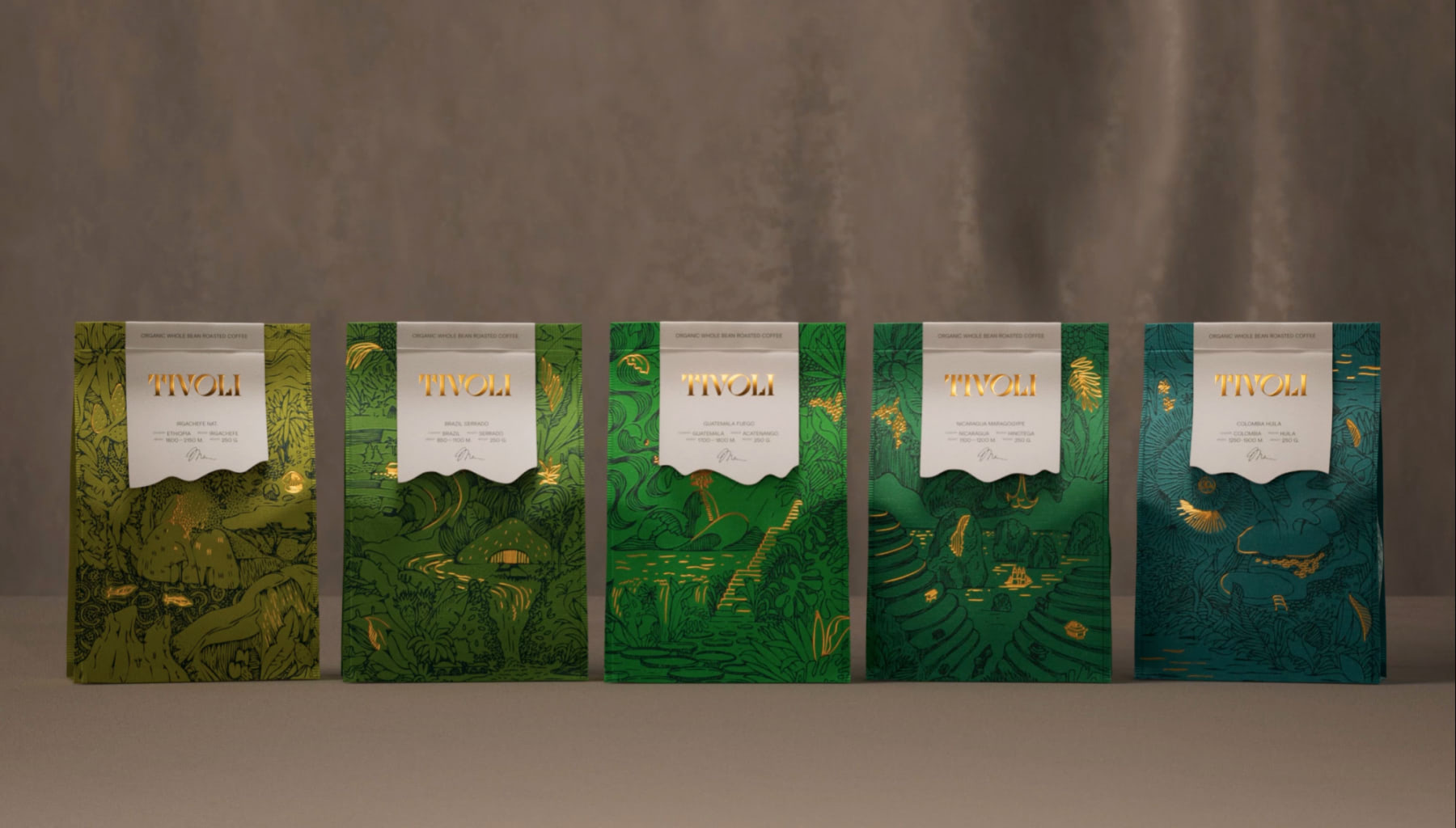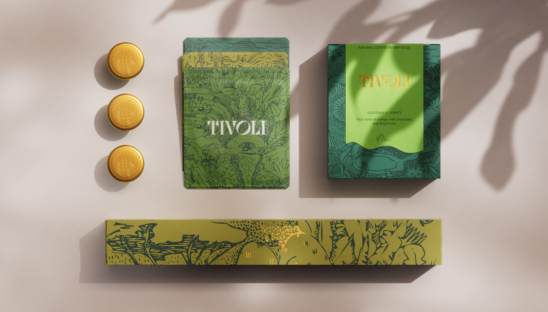 Создать айдентику и упаковку для компании TIVOLI, продающую лучший кофе из Колумбии, Бразилии, Вьетнама, Уганды и Эфиопии.