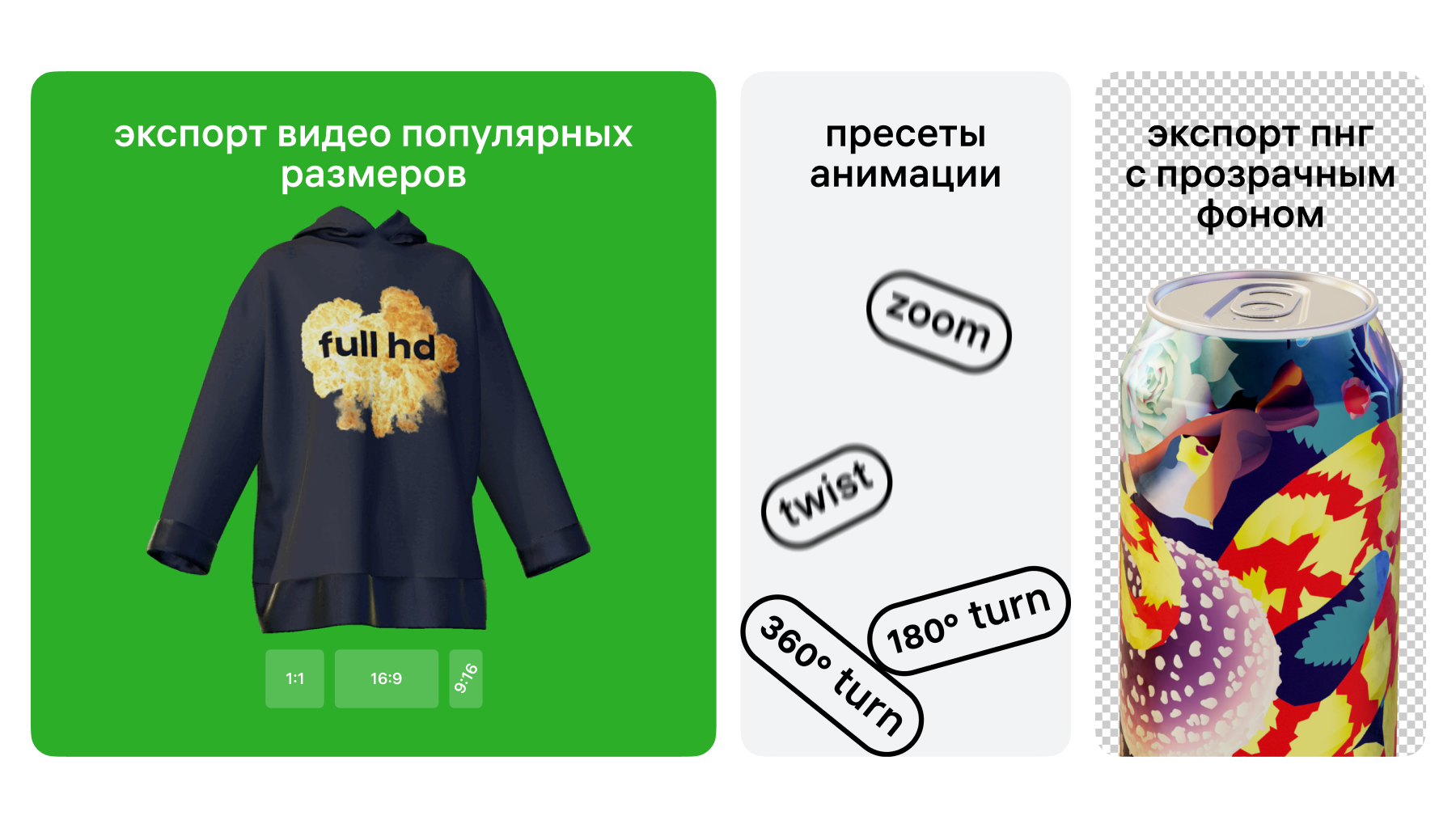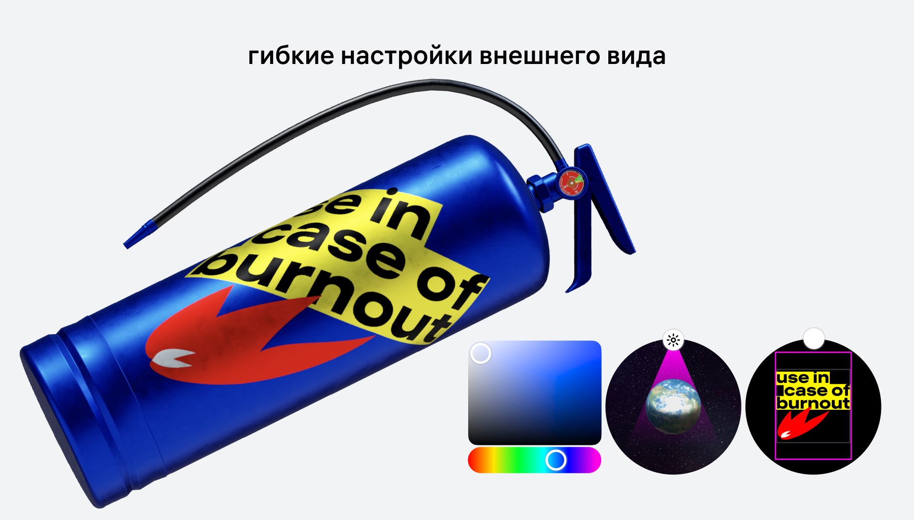 Все происходит в браузере: просто закинул логотип, настроил ракурс, цвет, свет — и готово. Не нужно возиться со сложными графическими редакторами — сплошная экономия времени на подготовке презентаций и анонсов.