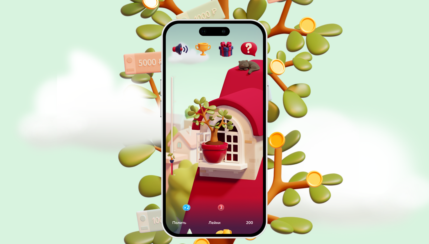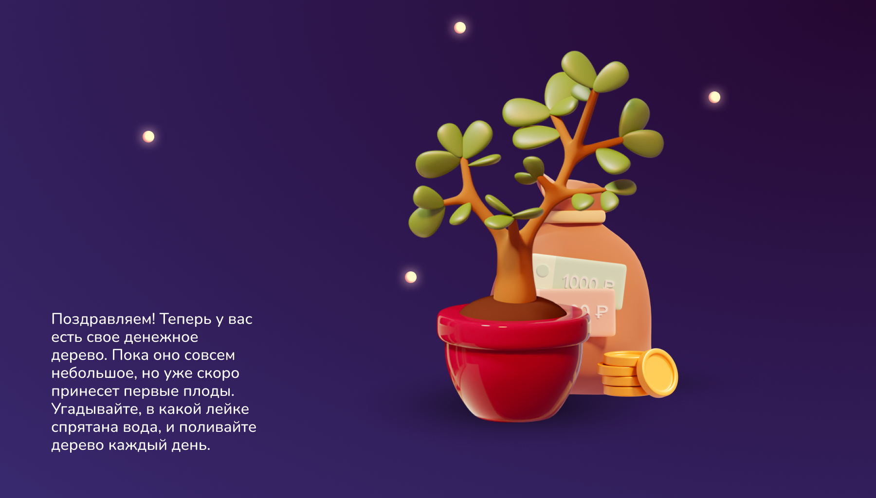 Из нескольких принесенных механик выбрали “Денежный урожай”. Игра построена на миксе тамагочи и лутбоксов. Пользователь поливает и растит свое дерево, затем собирает с него урожай из призов. Чтобы полить дерево нужно предварительно угадать в какой лейке вода.