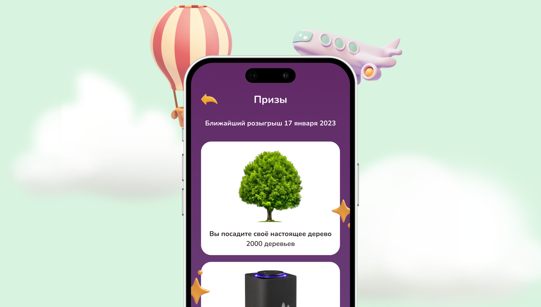 Для тех, кто вырастил свое дерево на максимум есть дополнительный приз. Всем, кто дойдёт до финала откроется поздравление и сообщение о том, что их виртуальное дерево стало реальным. Росбанк высадит настоящее деревце от имени каждого финалиста.