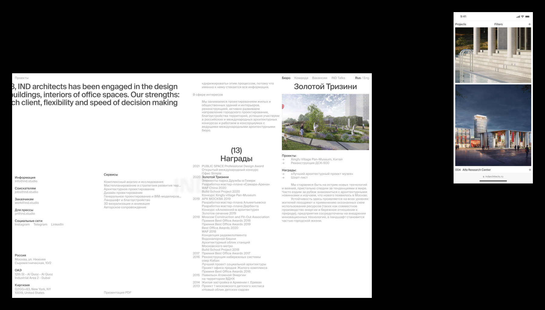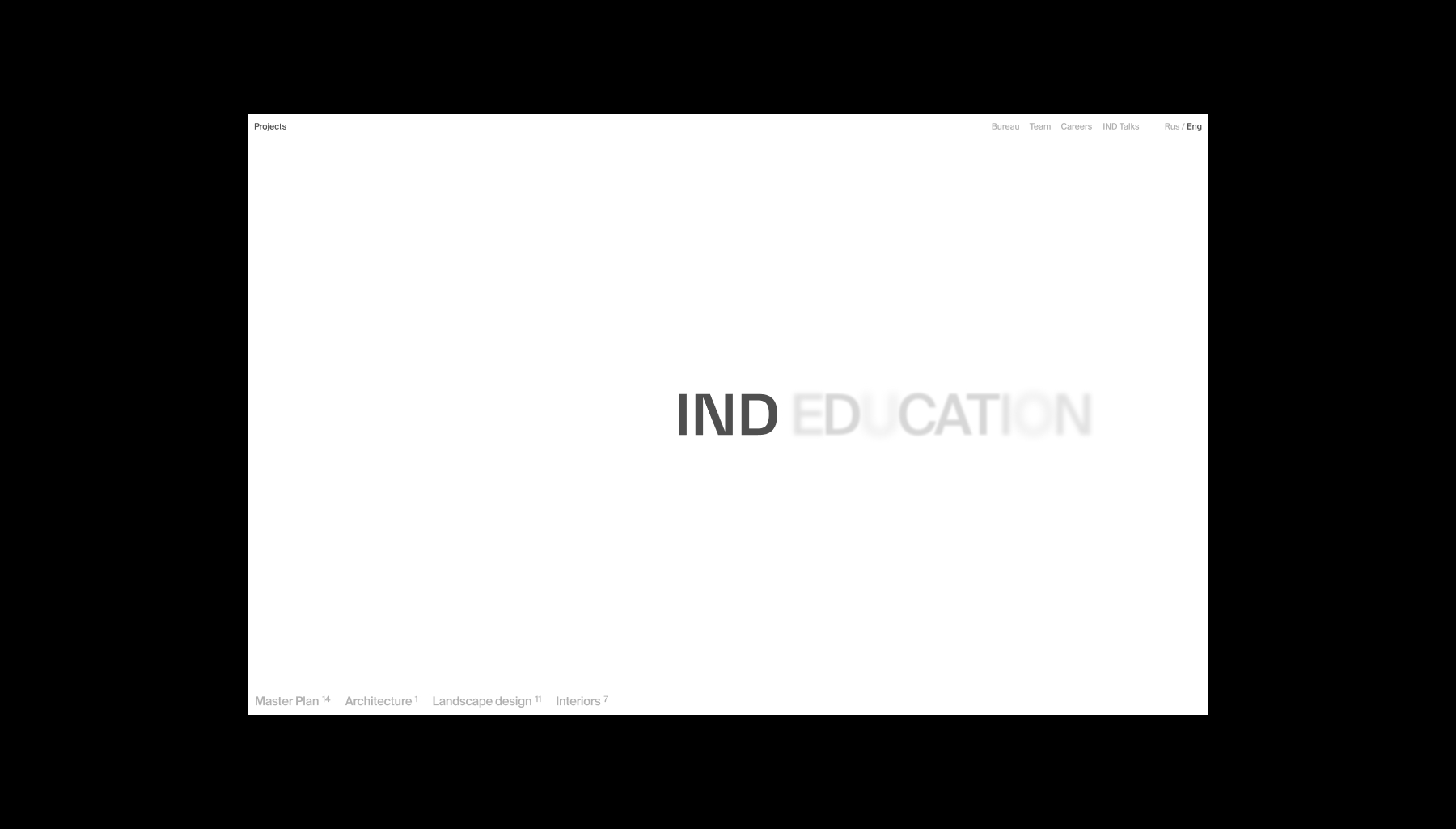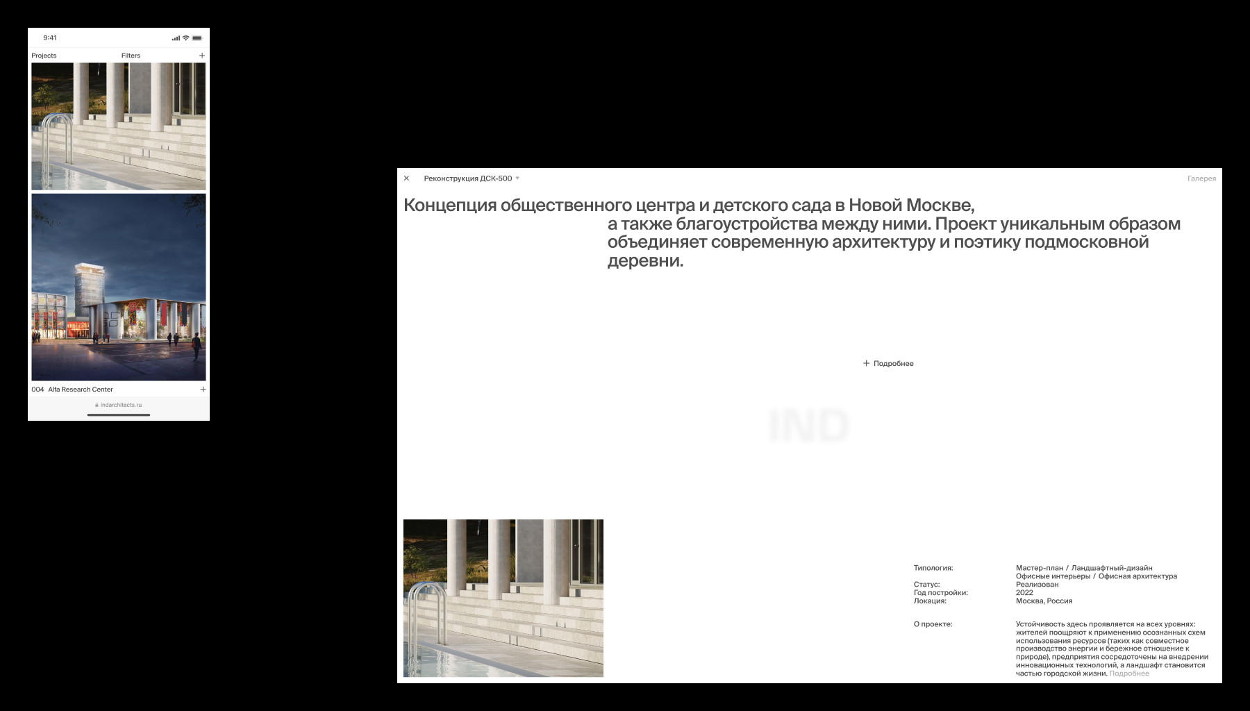 IND – архитектурное бюро, которое более 15 лет создает мультидисциплинарные проекты, основанные на идентичности и контексте. Новый сайт бюро демонстрирует уникальные характеристики через бесшовные переходы между разделами сайта, тем самым показывая их гибкость и глубокую экспертизу в разных сферах. Стремление IND выходить за границы привычного и внедрять новые технологии отображаются в появляющейся информации из-за пределов экрана, которая скрыта по-умолчанию. Это решение не только помогает подчеркнуть их особенность, но и служит вспомогательной механикой, за счет которой мы можем распределять фокус внимания.
