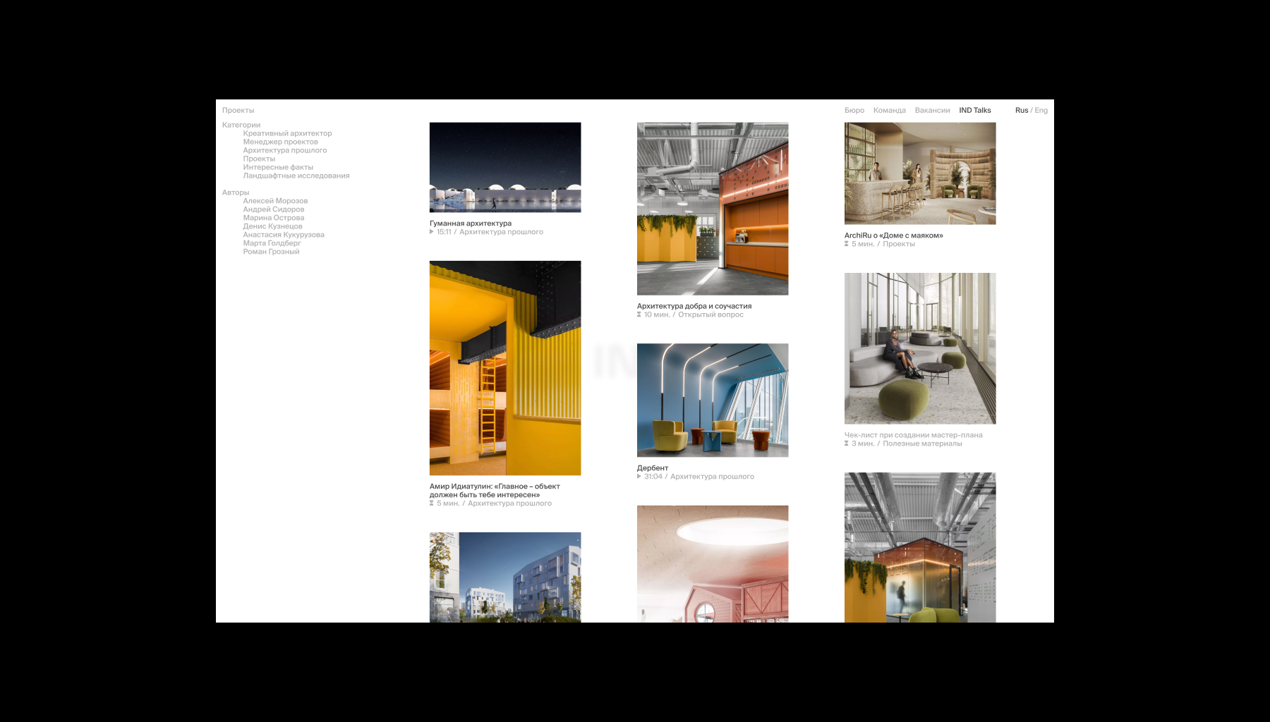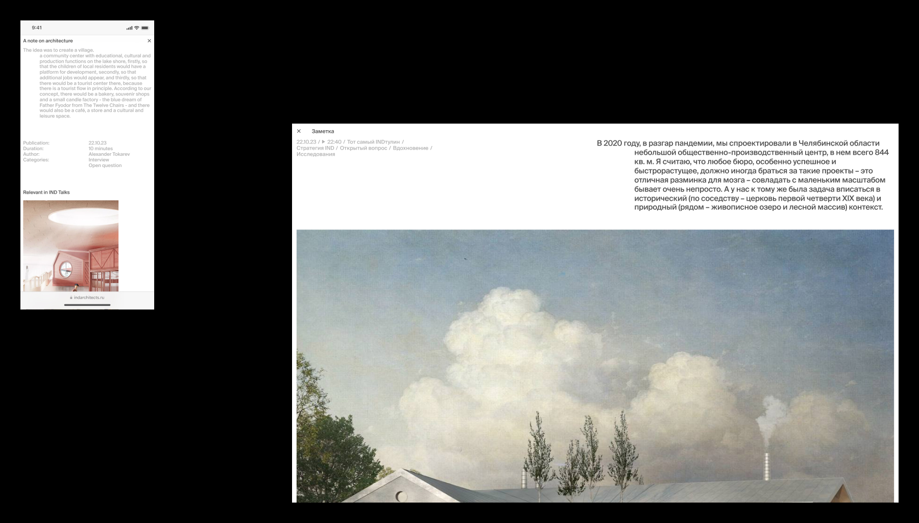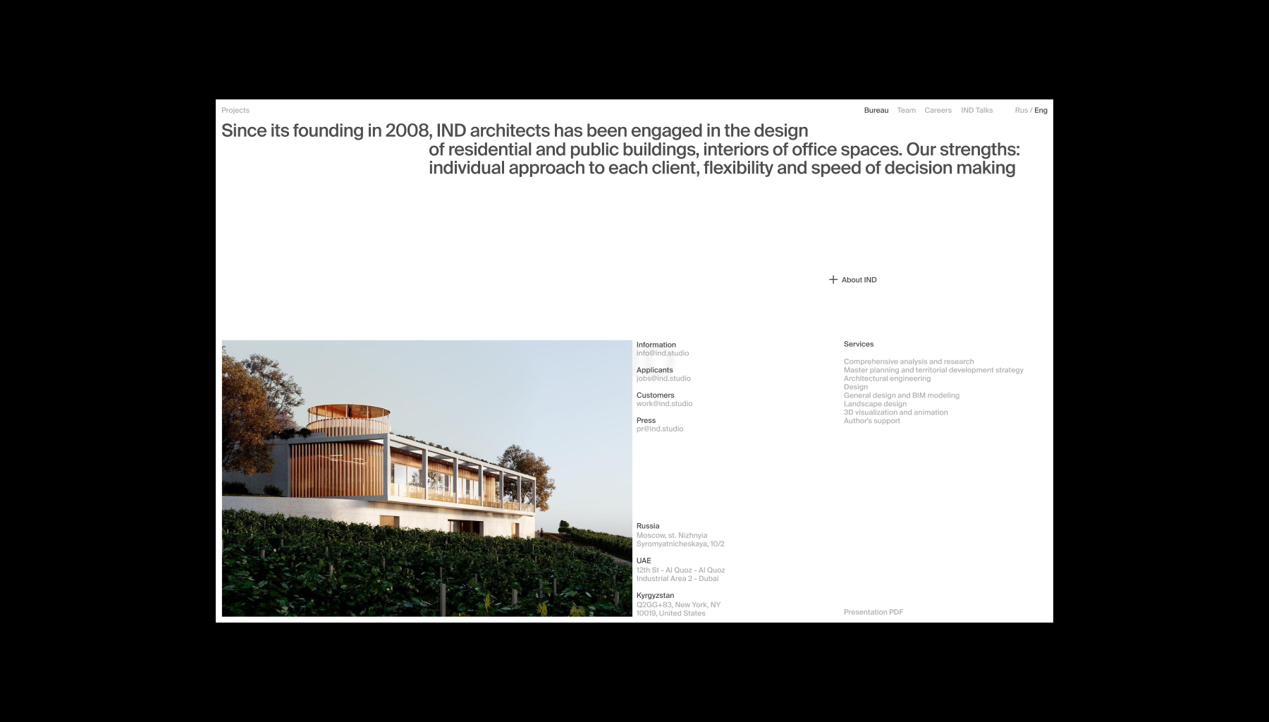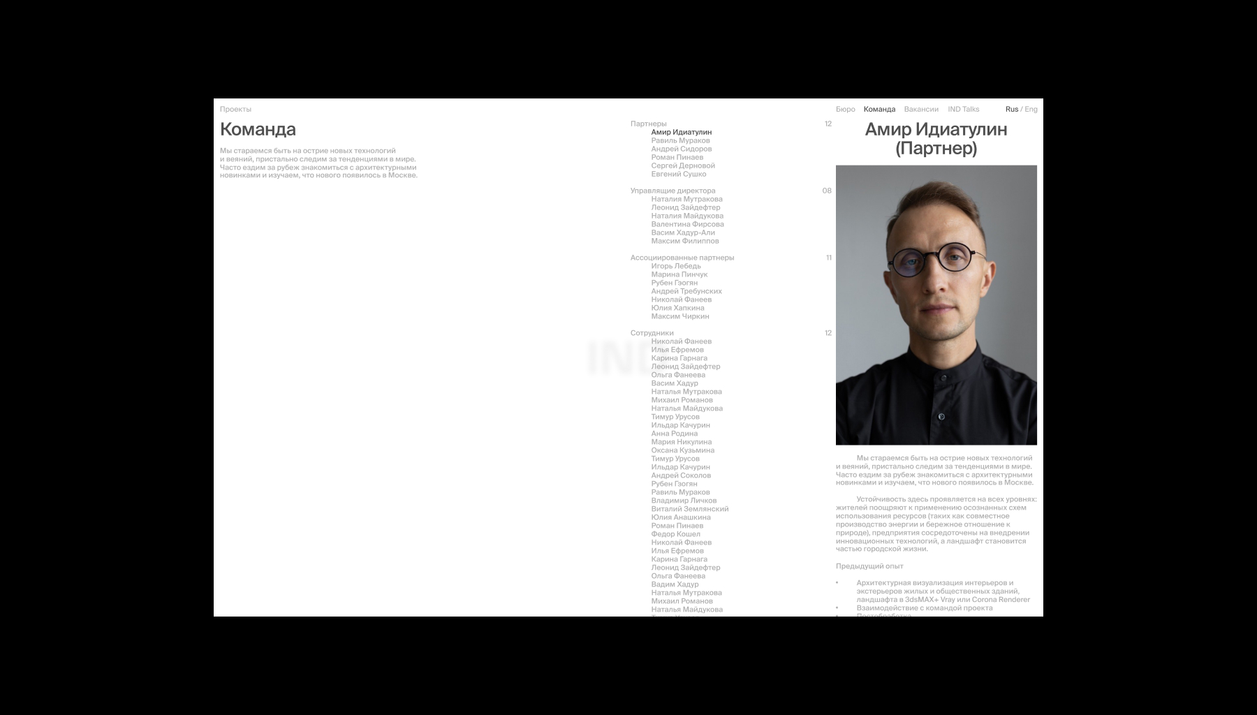 IND – архитектурное бюро, которое более 15 лет создает мультидисциплинарные проекты, основанные на идентичности и контексте. Новый сайт бюро демонстрирует уникальные характеристики через бесшовные переходы между разделами сайта, тем самым показывая их гибкость и глубокую экспертизу в разных сферах. Стремление IND выходить за границы привычного и внедрять новые технологии отображаются в появляющейся информации из-за пределов экрана, которая скрыта по-умолчанию. Это решение не только помогает подчеркнуть их особенность, но и служит вспомогательной механикой, за счет которой мы можем распределять фокус внимания.