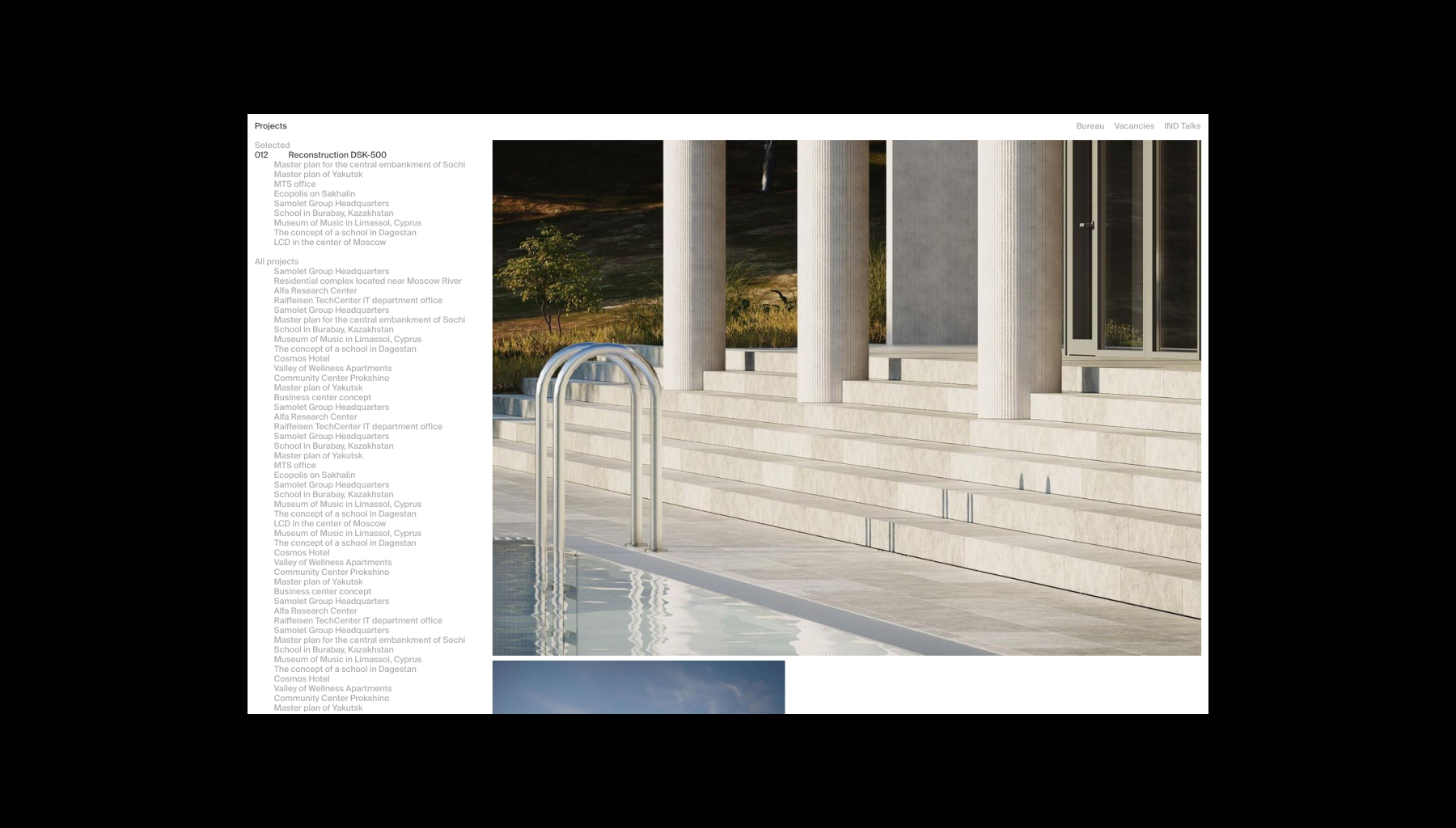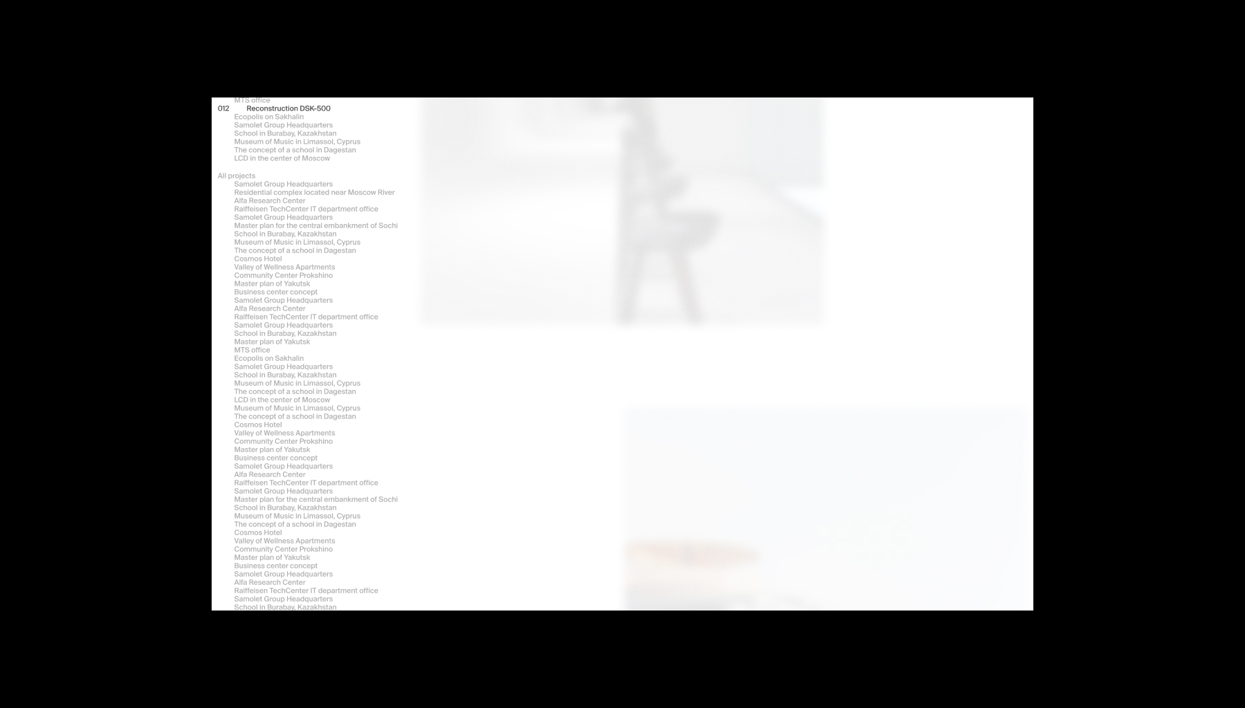Отдельной задачей было показать масштабность бюро и их многолетний опыт через работы. Чтобы решить задачу отображения всех 100 проектов и при этом не делать страницу слишком длинной, мы пришли к решению разделить ее на две части – текстовый список и лента фотографий. Таким образом мы можем быстро навигировать по названиям и крупно размещать изображения проектов.