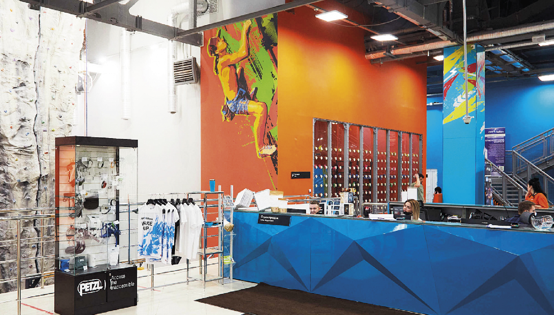 Следующим этапом стала интеграция стиля в пространство спорткомплекса. Помещение выдержано в лофтовой, брутальной манере. Истоками стилеобразующей графики интерьера послужили стиль граффити и потёртые надписи на досках для сёрфинга. Такая неформальная эстетика близка и понятна аудитории, она соответствует характеру пространства и самого бренда.