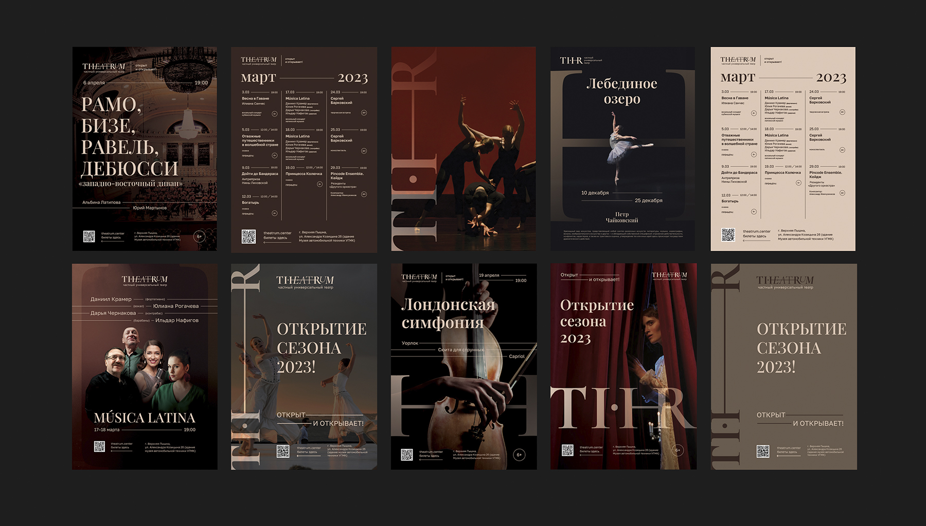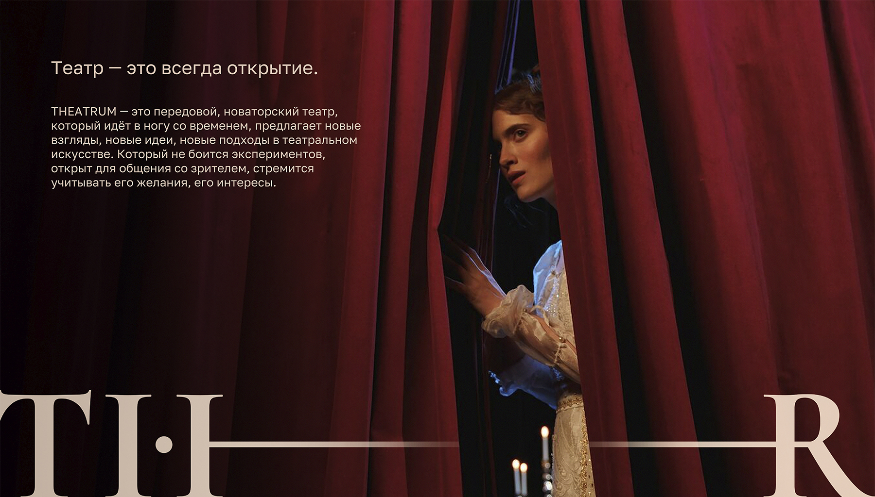 Соединительный штрих букв H и R для аббревиатуры «THR» от полного логотипа «THEATRUM» буквально дублирует позиционирование. Линии на текстовых блоках подчеркнули позиционирование и встроились в траекторию чтения, открывая зрителю искомую информацию.