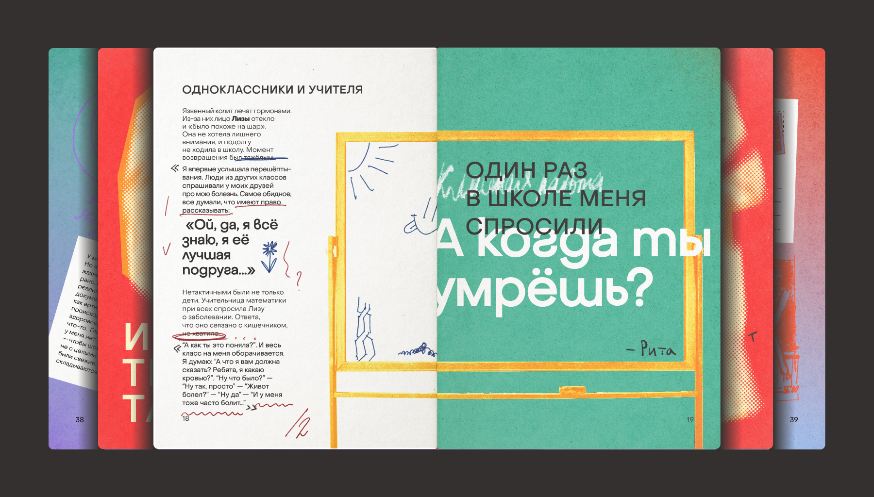Дизайн "Invisible Mode" привлекает внимание и создаёт интимную атмосферу диалога между героем и читателем. Он сочетает в себе яркие цвета, письменные пометки и визуальные элементы: рисунки и надписи, созданные самими героями. Это создает инклюзивное и партиципаторное визуальное повествование, которое позволяет читателям глубже понять и сопереживать истории героев.