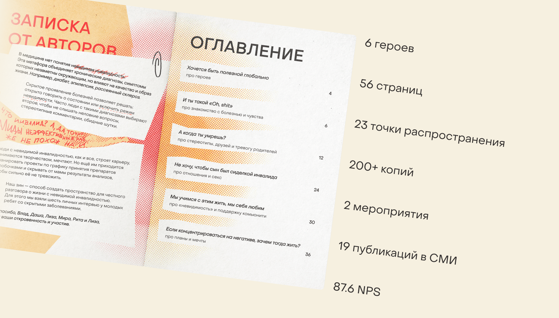 Более 200 экземпляров зина распространены безвозмездно в 23 локациях Москвы и Санкт-Петербурга (Гараж, Винзавод, Рихтер и т.д.) на постоянный показ. В поддержку проекта и темы невидимых инвалидностей организованы два мероприятия, включая презентацию в ГЭС-2 и паблик ток в КЦ ЗИЛ.