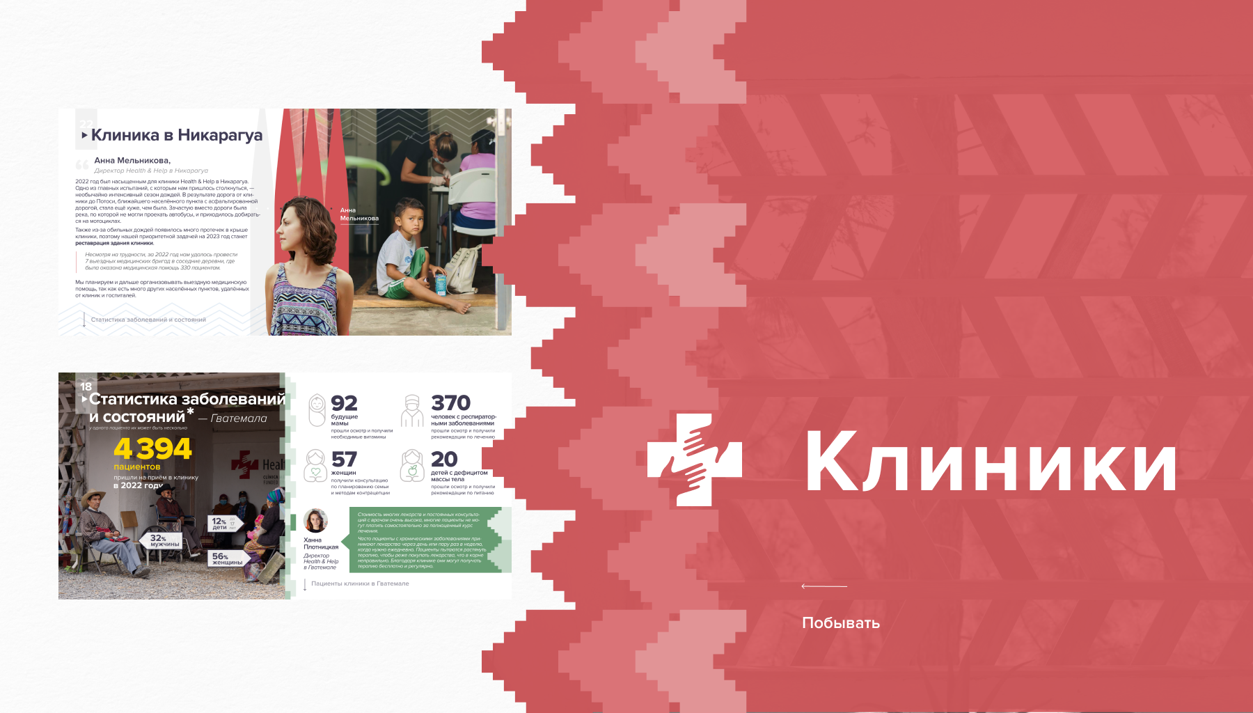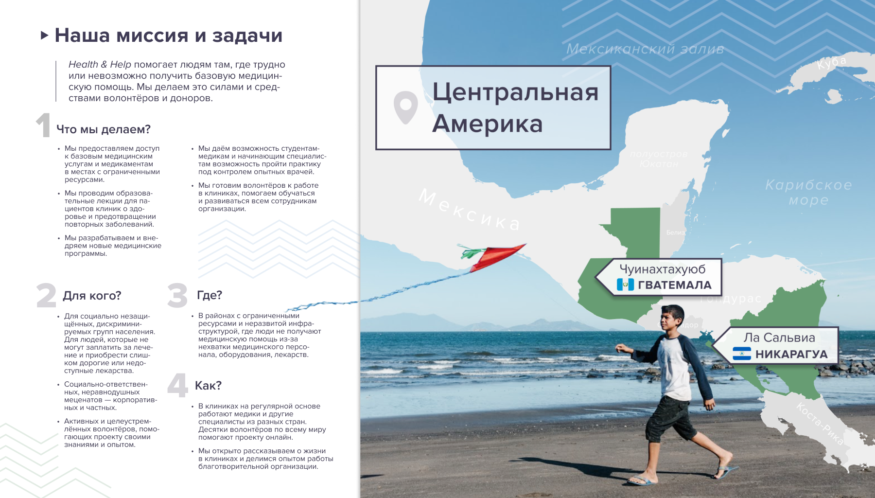 Мы предоставляем медицинскую помощь в Латинской Америке и многие дизайнерские решения у нас подобраны неслучайно: геометричные паттерны отсылают к архитектуре наших благотворительных клиник, красный символизирует инициативность и благодарность, а известный крест с протянутыми друг к другу руками, мы горды использовать как экспрессивный визуальный референс к гуманитарной помощи.