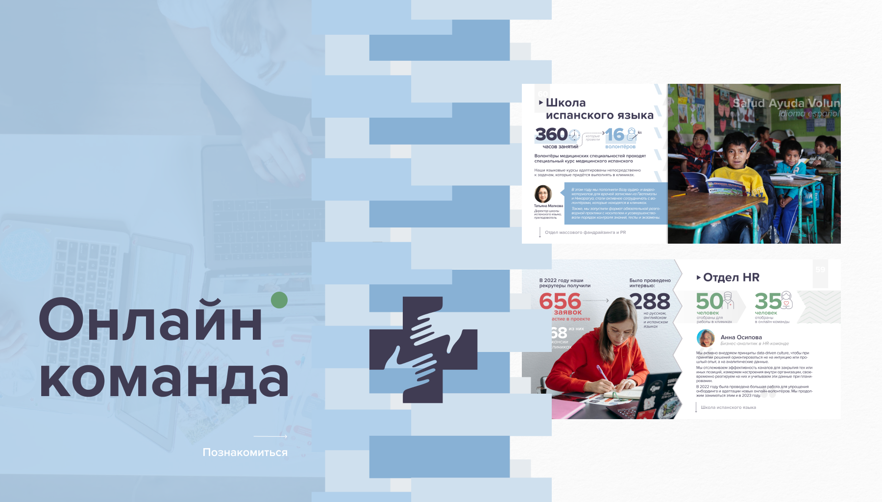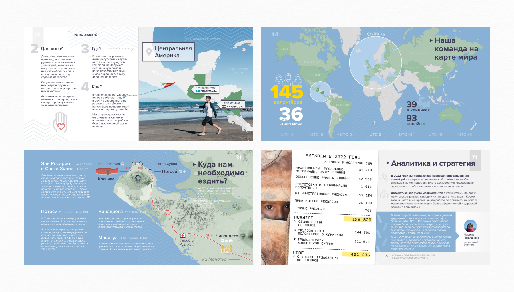 Тем не менее в годовом отчёте двадцать второго года мы сделали упор на другом — в использовании желтого и голубого цветов, как символов солидарности к нашим волонтёрам и всему миру. В этом году мы в очередной раз обращаемся к своей миссии и гуманистическим ценностям, и надеемся, что они найдут отклик в вас!