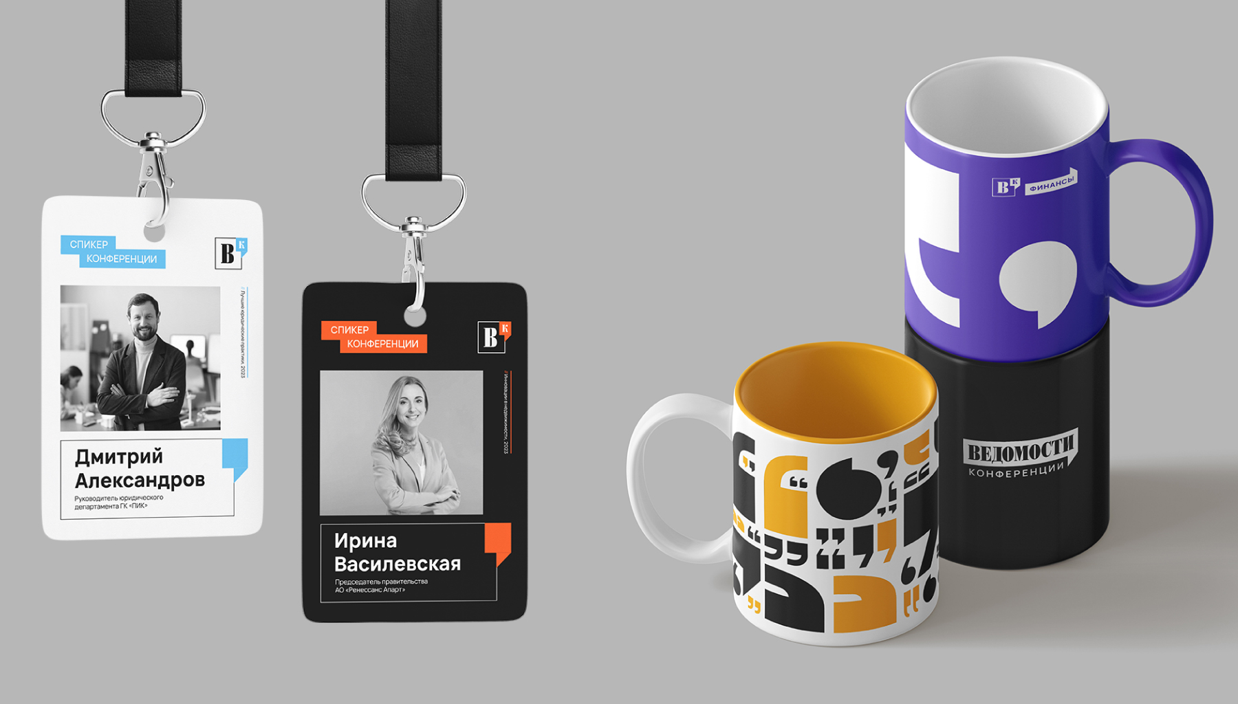 Основополагающим образом новой айдентики стала метафора открытого диалога, возможности для которого и создаёт бренд «Ведомости Конференции». Так как деятельность бренда неразрывно связана с диалогом, общением, нетворкингом, обучением и публичными мероприятиями, главным графическим образом стали кавычки, символизирующие речь и цитирование. Именно они легли в основу нового логотипа «Ведомости Конференции», логотипов направлений работы бренда, графических элементов и паттернов. Благодаря использованию простых и понятных аудитории образов и минималистичной графики нам удалось создать для бренда айдентику, органично объединяющую в себе одиннадцать направлений организации конференций, и создающую целостный, современный и релевантный образ «Ведомости Конференции».