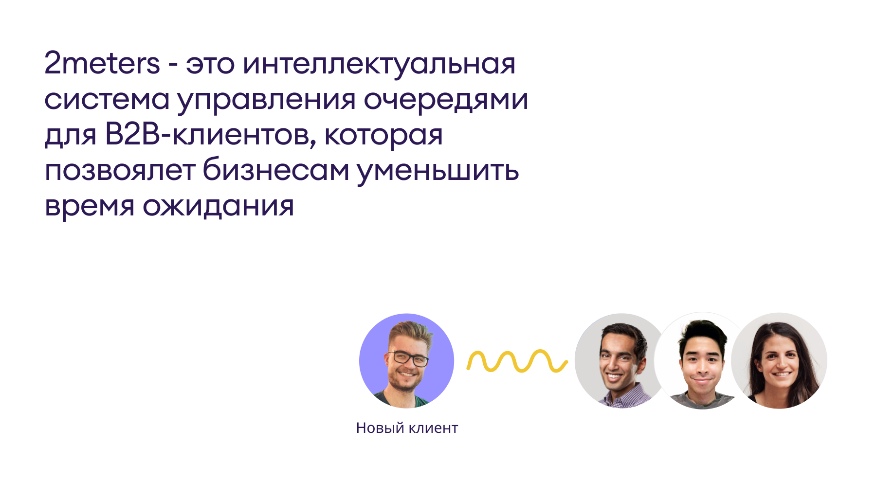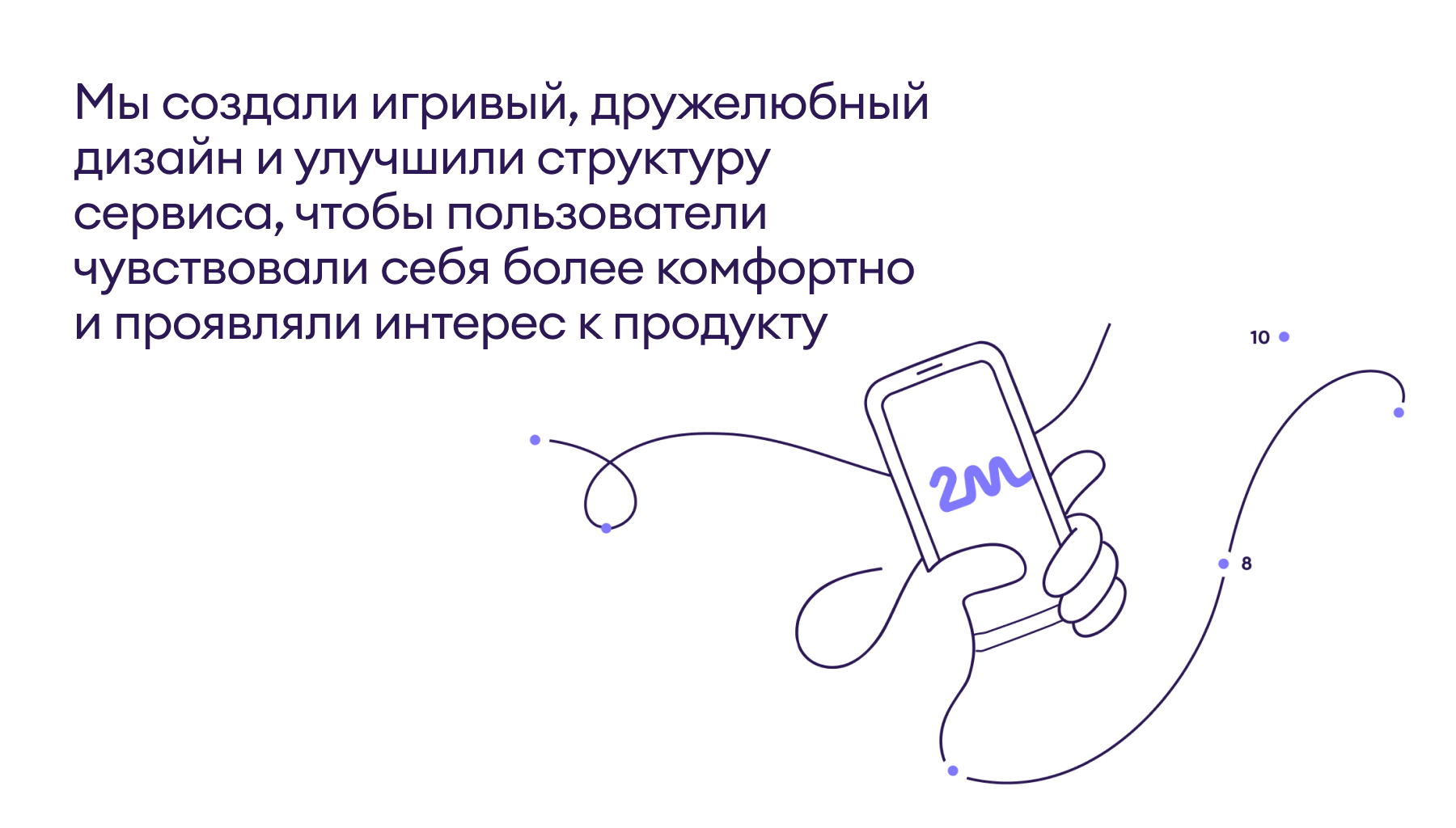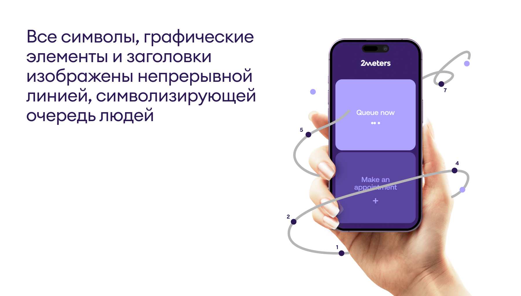 В работе над проектом мы прежде всего стремились раскрыть ценность сервиса для B2B-клиентов, показав полезность новой для целевого рынка услуги через интуитивные и эмоциональные образы. В основе наших визуальных решений – серия перекликающихся метафор. Во-первых, это соединение множества разрозненных точек через построение оптимальной траектории – символическое упорядочивание хаоса. Алгоритм приложения автоматически систематизирует пространство разрозненных запросов и временных слотов, преобразуя его в понятную и масштабируемую последовательность. Во-вторых, очередь мы изобразили как змейку, которая с легкостью огибает острые углы в своем непрерывном движении. Наконец, центральная метафора змейки усиливается и закрепляется благодаря многократному повторению зеркальных букв M и W в слоганах. В дизайне сайта округлые контуры иллюстраций и теплые, расслабленные цвета транслируют исходный месседж приложения: очереди не должны становиться проблемой.