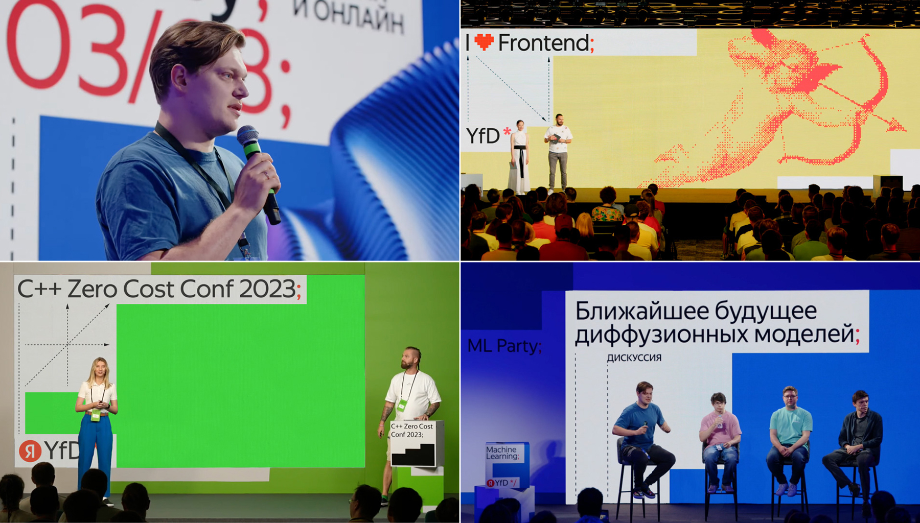 Мероприятия YfD дифференцируются уникальными графическими ходами. Для конференций это генеративная графика, для митапов — система абстрактных трехмерных объектов, а для неформальных встреч — соотвествующие их тону и характеру стикеры.