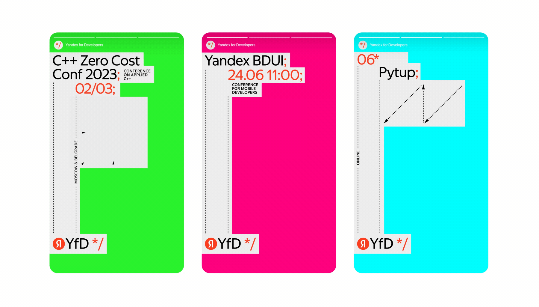 Yandex for Developers (YfD) — платформа для нетворкинга и развития специалистов из IT-индустрии. Новая гибкая дизайн-система бренда основана на типографике, адаптирующей общие правила синтаксиса языков программирования. События разных направлений артикулированы с помощью кастомного генератора моушн- и статичной графики, дополненного яркой и разнообразной цветовой палитрой.