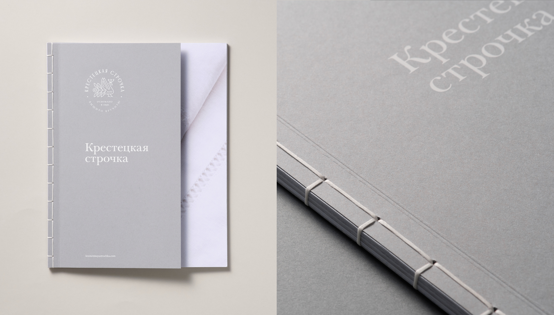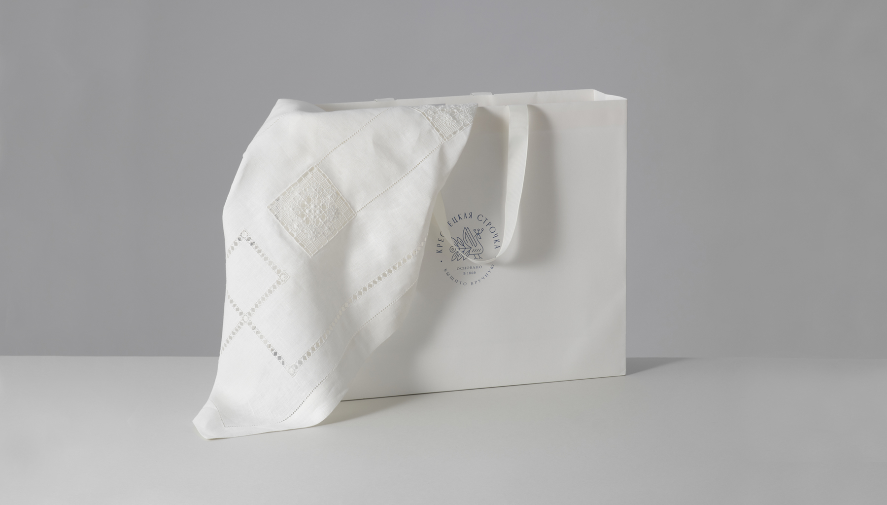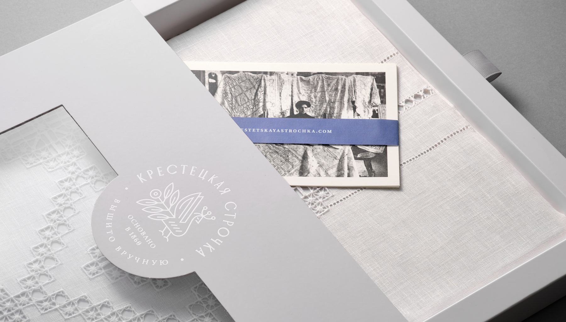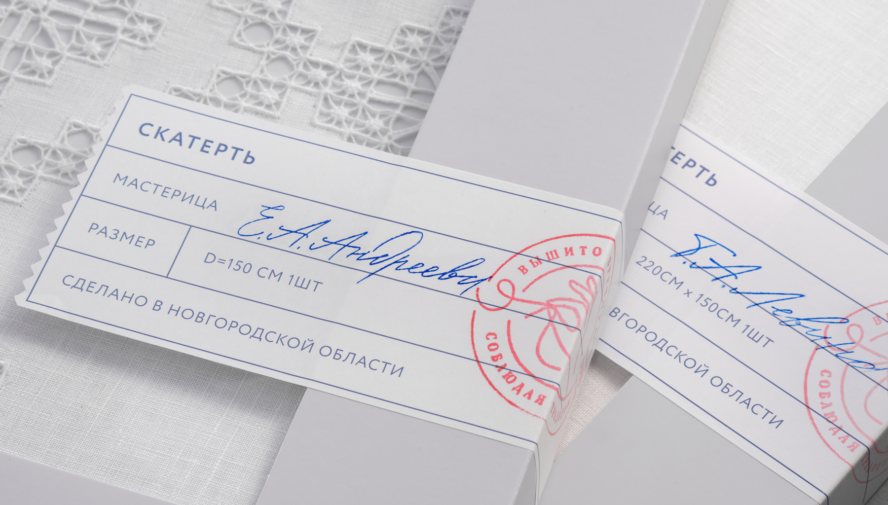 Мы сохранили образ птицы из предыдущей версии логотипа. При этом облегчили его и привнесли чёткие геометричные линии, свойственные Крестецкой вышивке. Разработали упаковку, аккуратно обрамляющую текстиль и подчёркивающую ручную работу — каждый конверт прошивается вручную на фабрике. Для мастериц создали индивидуальные штампы с фамилией, которые ставят на упаковку. На бирках предусмотрели место для написания количества часов, потраченных на вышивку изделия.