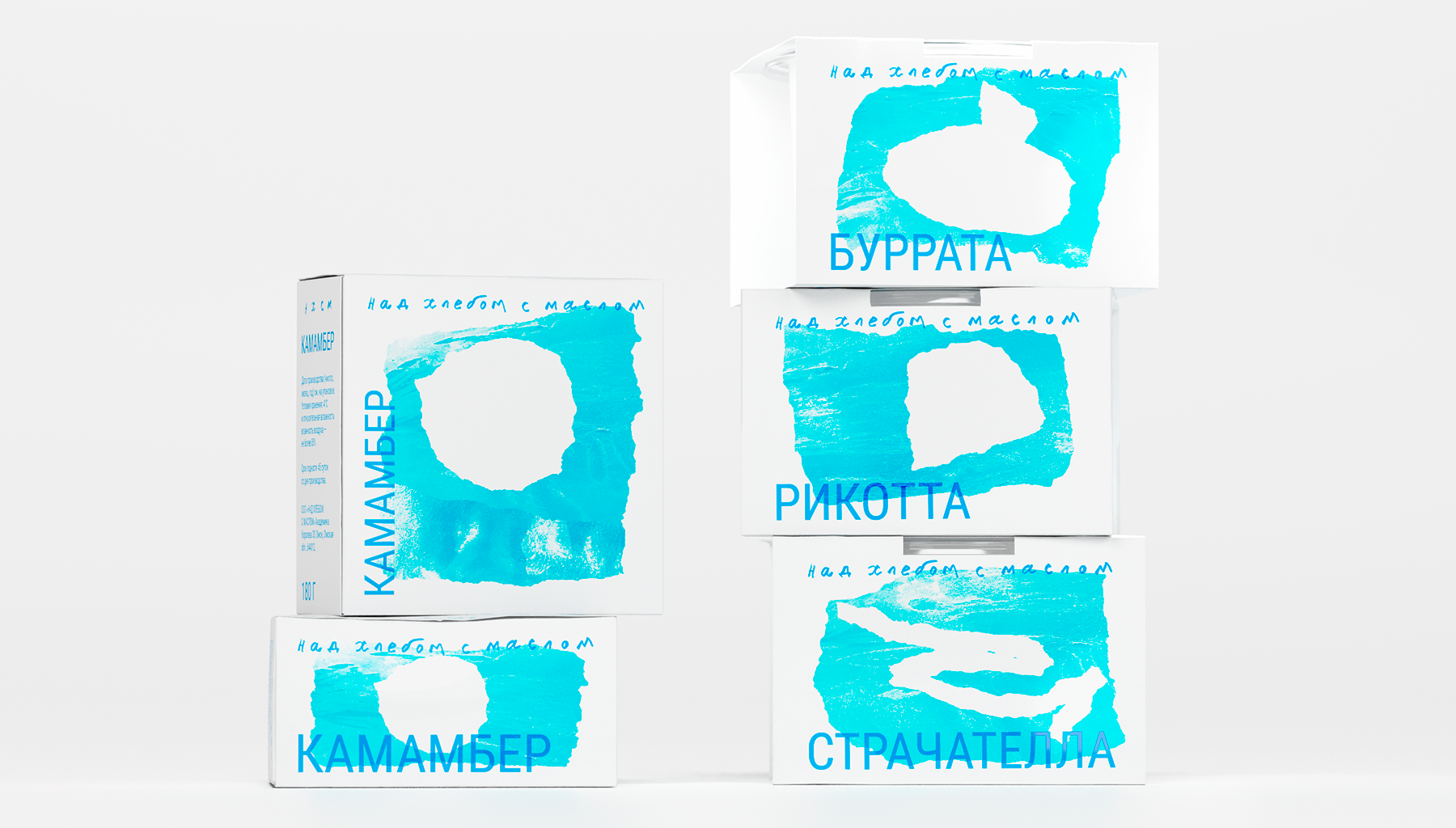 Каждый вид сыра обладает уникальным форм-фактором упаковки. Для поддержания узнаваемости бренда в основе каждого типа упаковки — квадрат. Также этот прием отсылает к раме с пейзажем.