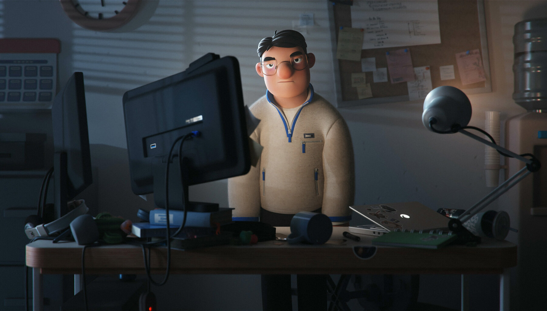 Для этой истории мы выбрали реалистичное 3D, ненасыщенную гамму и легкий нуарный вайб.